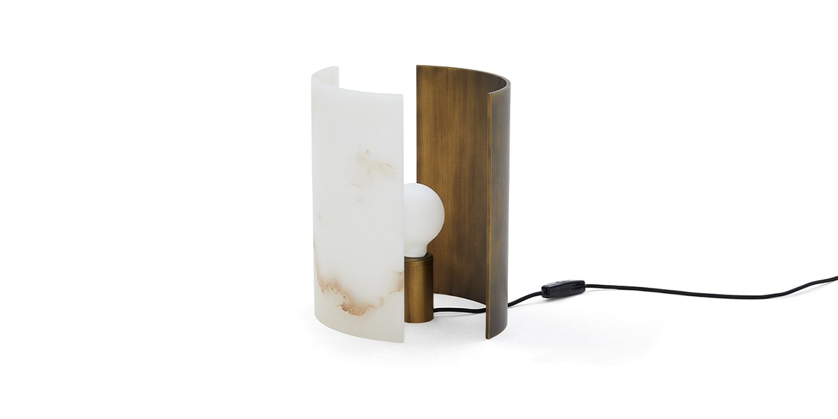 The deconstruction of shadows. An interplay of solids and voids outlines this deconstructed lamp. A light source rested on a bronze cylinder is equipped with two moving panels, one in satin-finish brass-coloured aluminium and another in translucent alabaster, creating elegant light effects. These backdrops made of different materials offer an alternation of warm and delicate lighting. Lastly, the black cotton thread features a dimming system that adjusts the intensity of the light fixture.