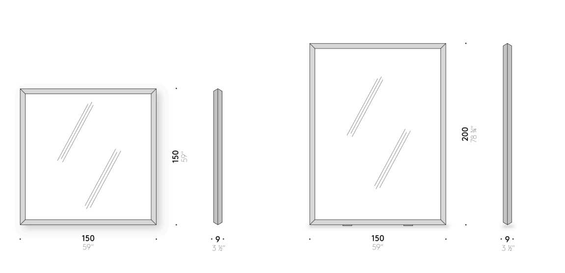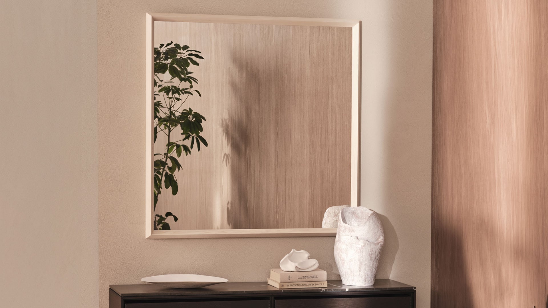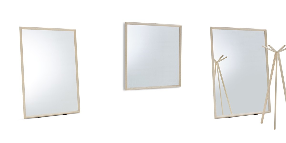 The sophistication of simplicity. In celebration of a 20-year collaboration, Nendo renders linear the aesthetic elegance of the Rokumaru clothes hanger, transforming it into a mirror that is anything but linear. The frame in natural solid ash surprises through the detail of the corners. Available in two sizes, rectangular for the wall-mounted or floorstanding version, or square for wall-mounting only.