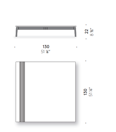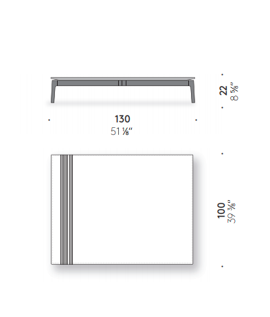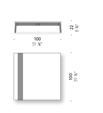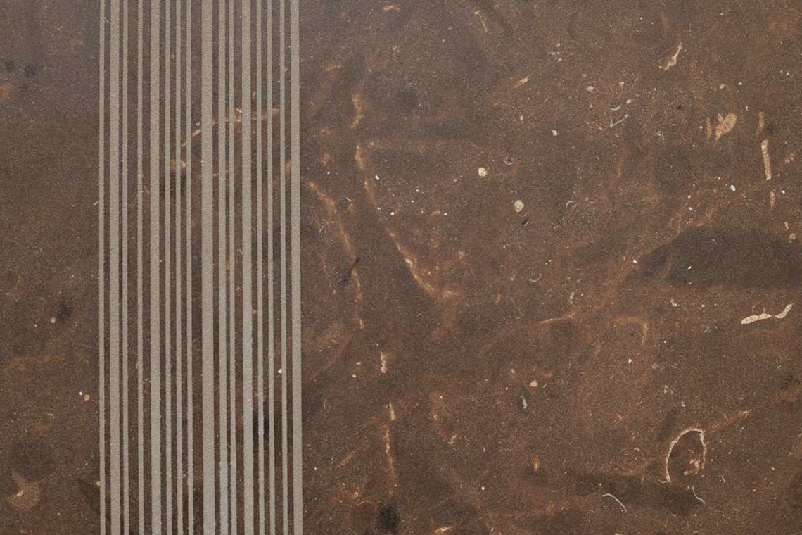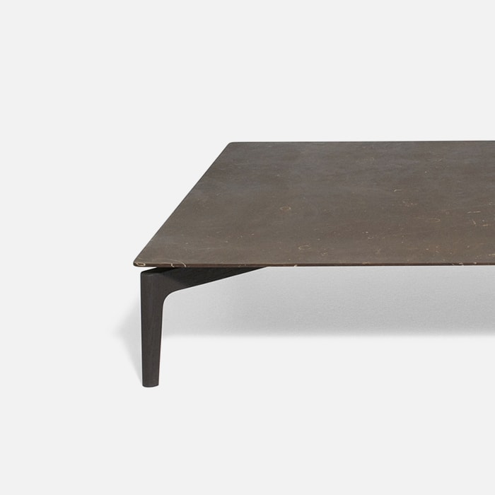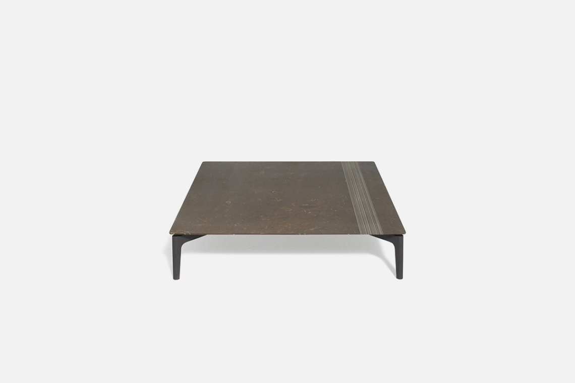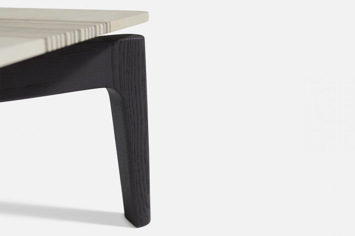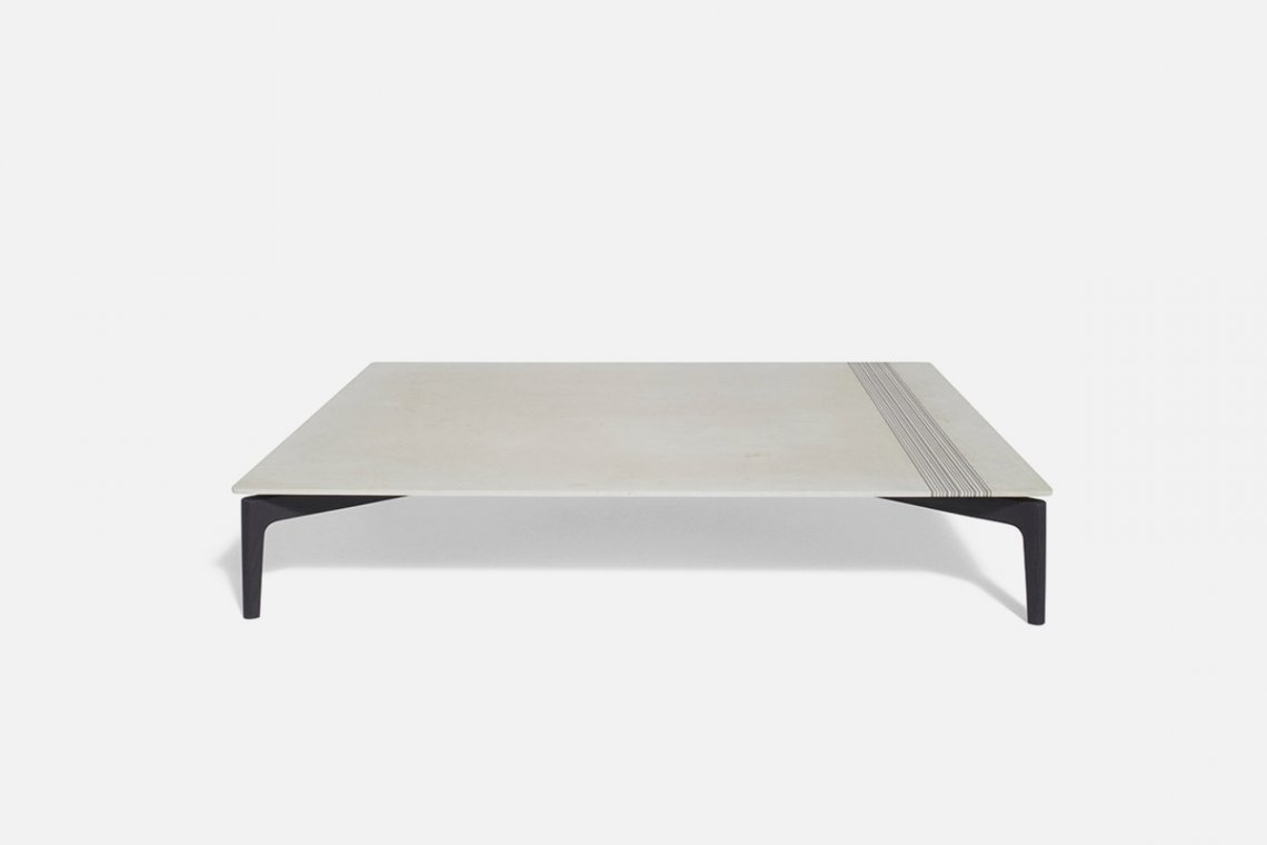 The low tables enhance the meeting of materials – wood and stone – that recalls in an understated way the iconic stripes of Paul Smith. The table-tops in Pietra Pece and Bianco Pece, a limestone with unique chromatic colour-shifts, are ‘scratched’ through the use of the mill.