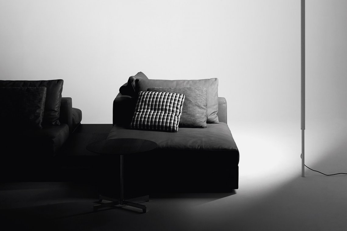 A luminous double line from floor to ceiling distributes light along the entire length of the metal tubes available in matte black or white. These two light sources can be switched on separately or together. There’s no bulk, but extreme versatility: turn it on its axis and the lighting completely changes in the space.