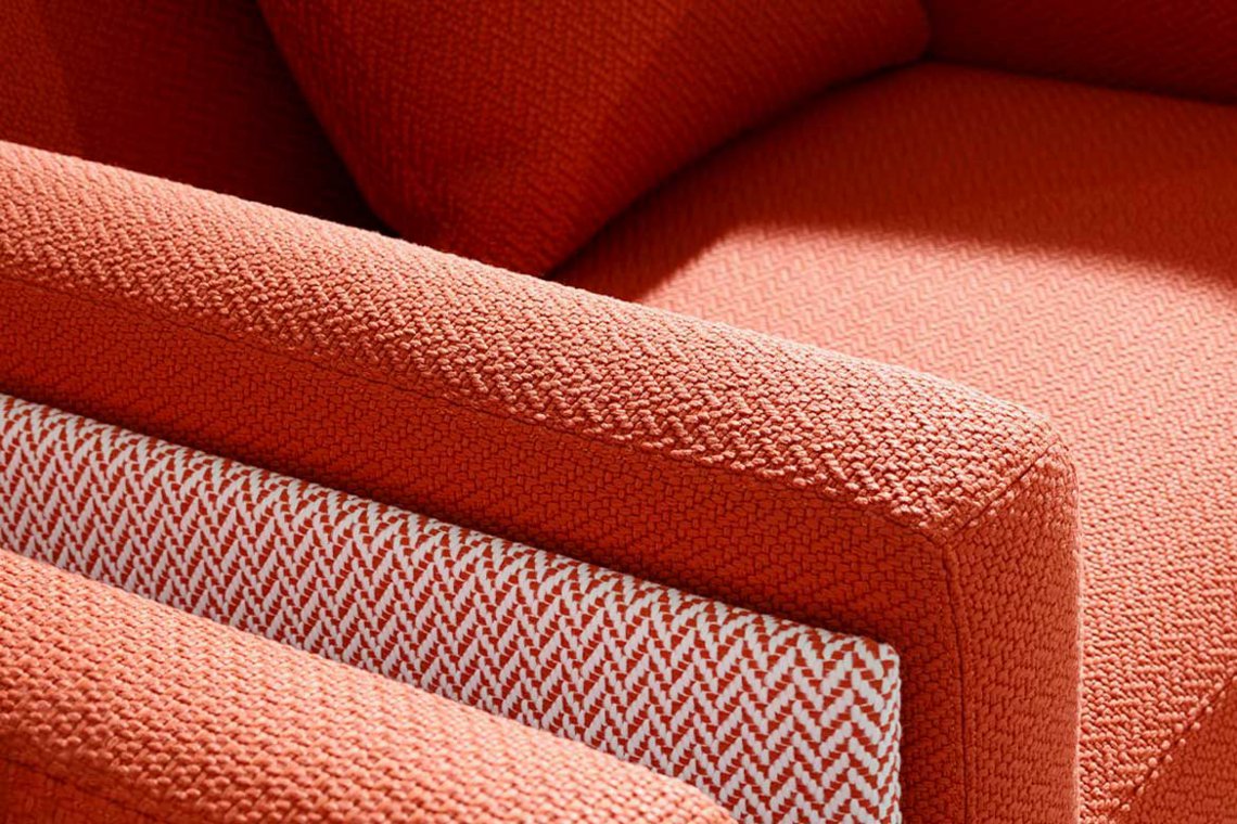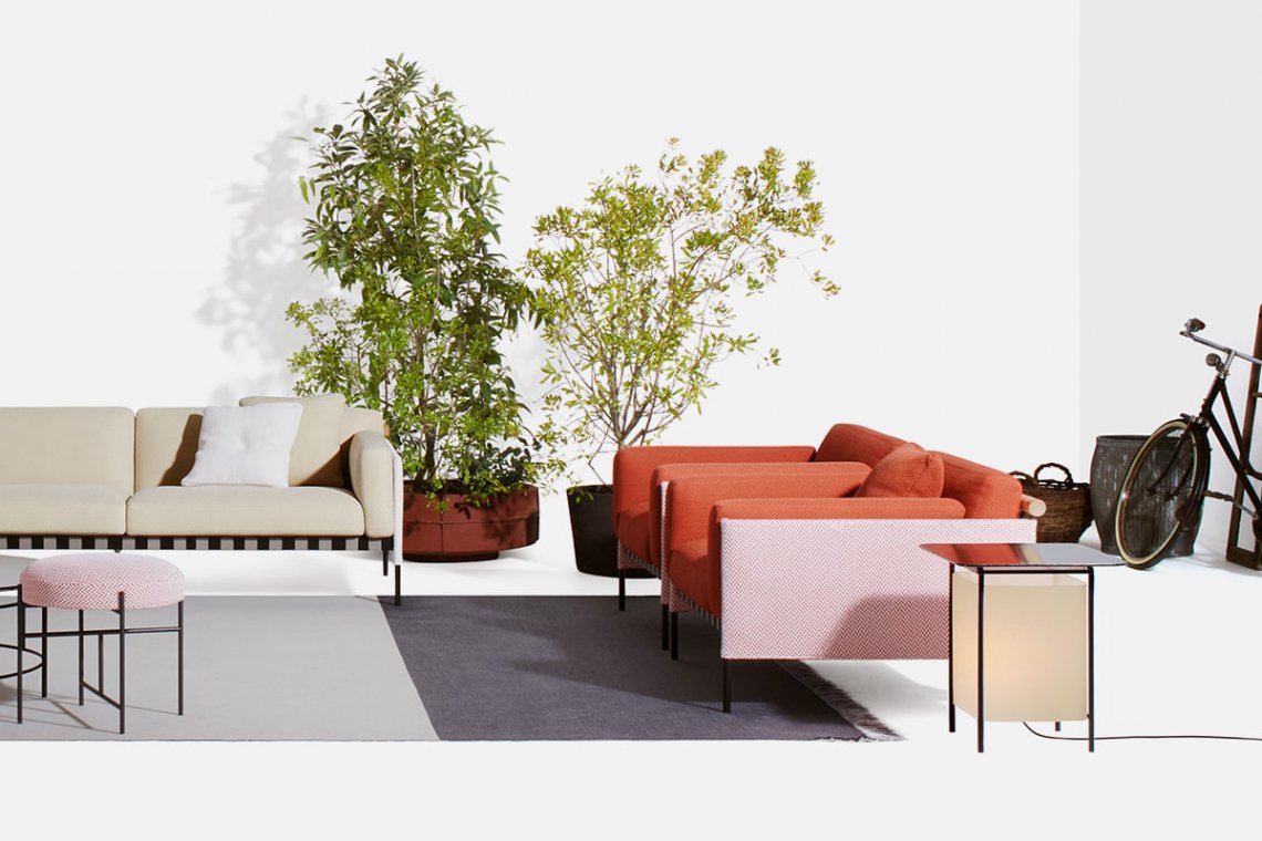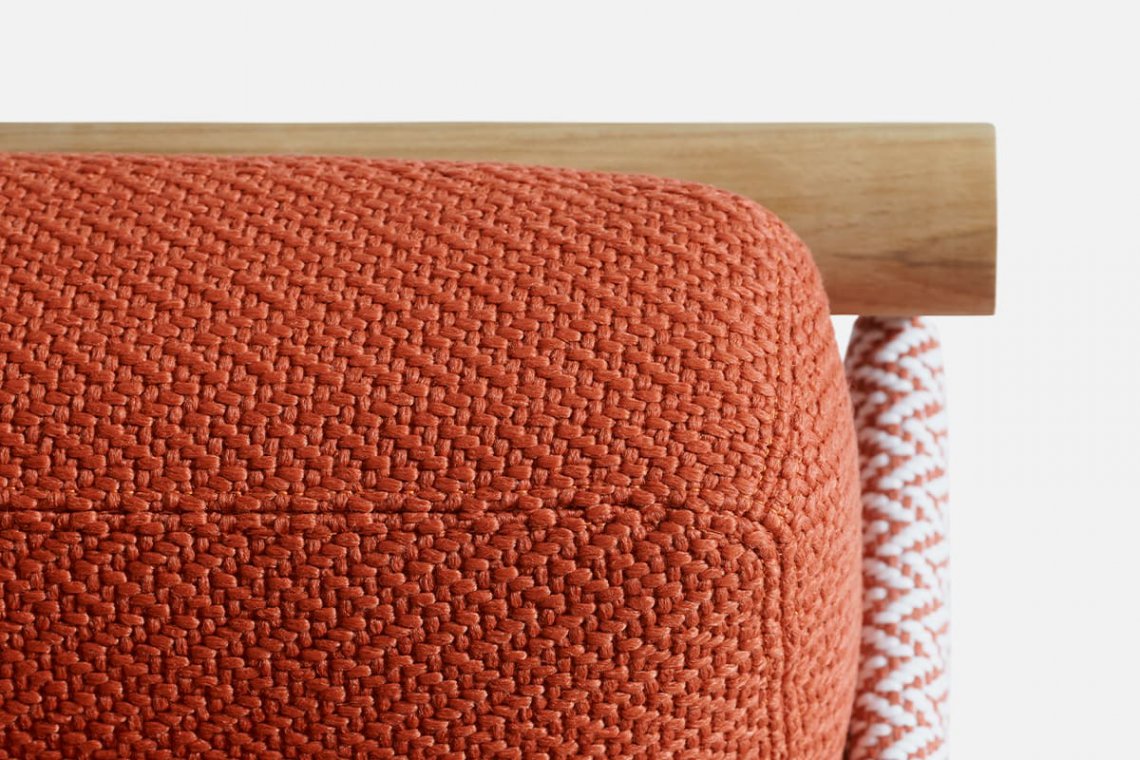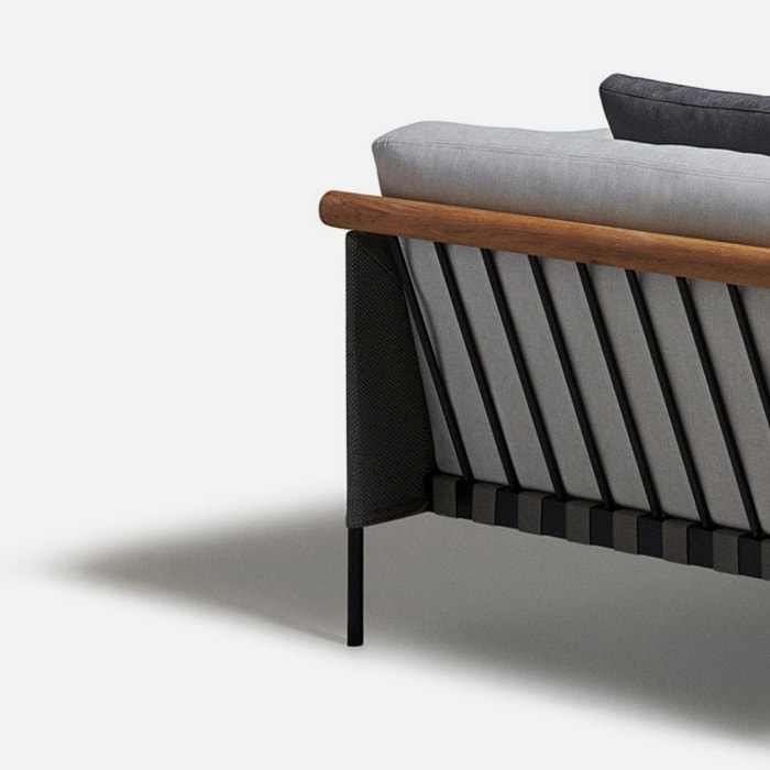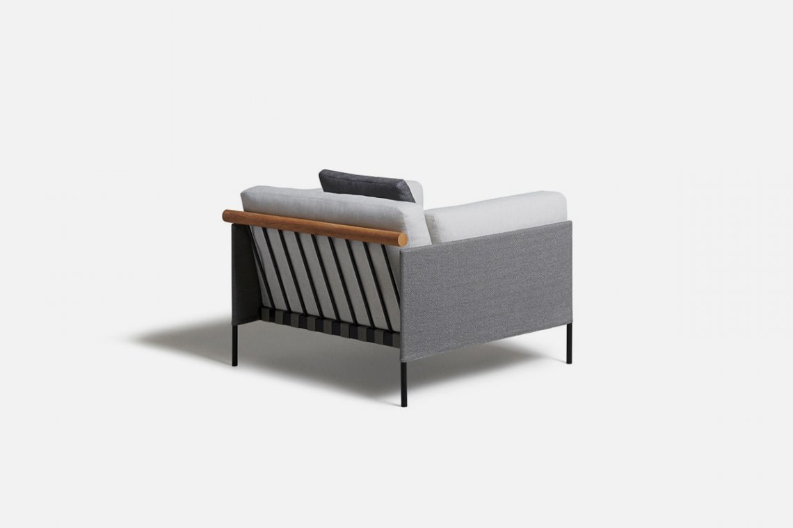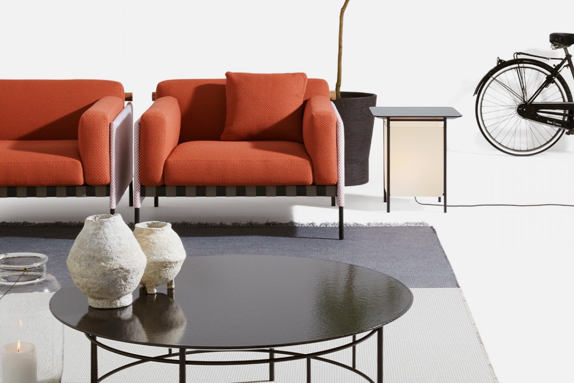 étiquette is a Scandinavian-inspired project that dialogues with superior Italian craftsmanship. Developed by design duo GamFratesi, the model includes a sofa, pouf and armchairs. The indoor piece lends itself perfectly to the outdoors thanks to a selection of finishes. The outdoor version features a body in matte black painted stainless steel that is complemented by elastic straps in a water-repellent fabric and a wood bar in natural teak. The atypical design is simple and essential, making it an excellent solution to mark out a space thanks to its unusual back view. The mood is completed thanks to functional aesthetic elements and refined combinations of precious and resistant yarns in neutral hues. étiquette Outdoor is paired with the Fezzan carpet, which is in Olyna, a recyclable, non-toxic and hypoallergenic water-resistant material that recalls the same natural tones of the armchair, pouf and sofa.