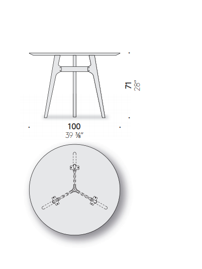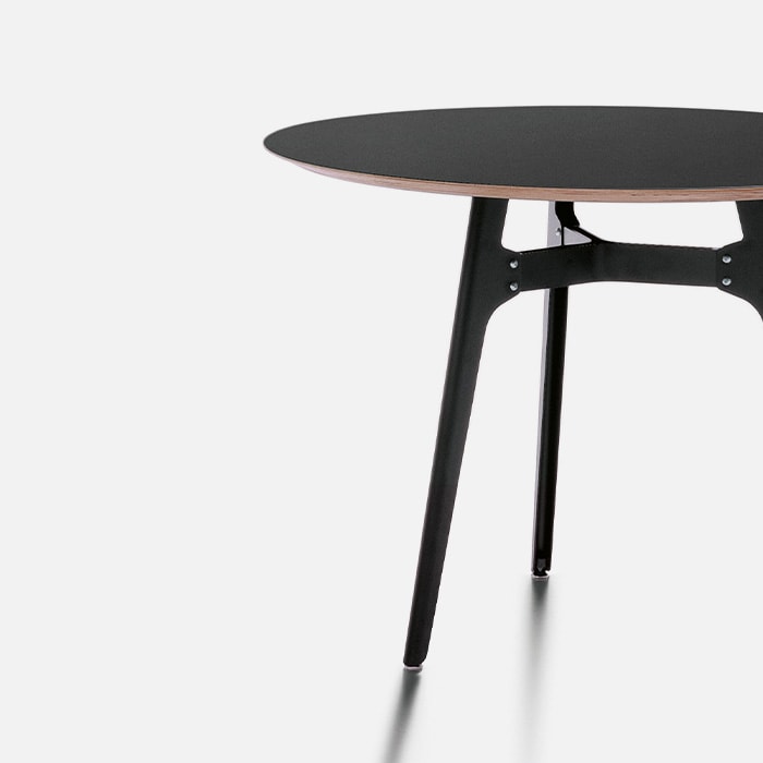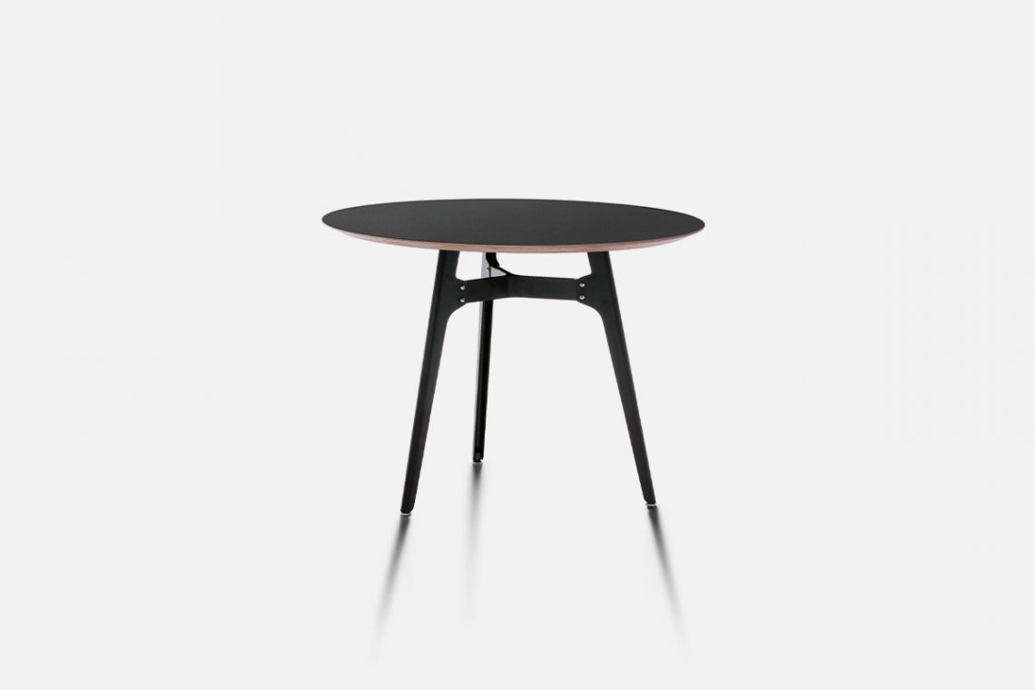 Balanced, elegant, tapered in its proportions. Otis is a round table for small dining areas and designer bistros, designed by the duo Lorenz+Kaz. Its base features curved sheet metal that recalls industrial stools. It defines small spaces with a clean design in versatile ways.