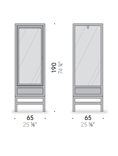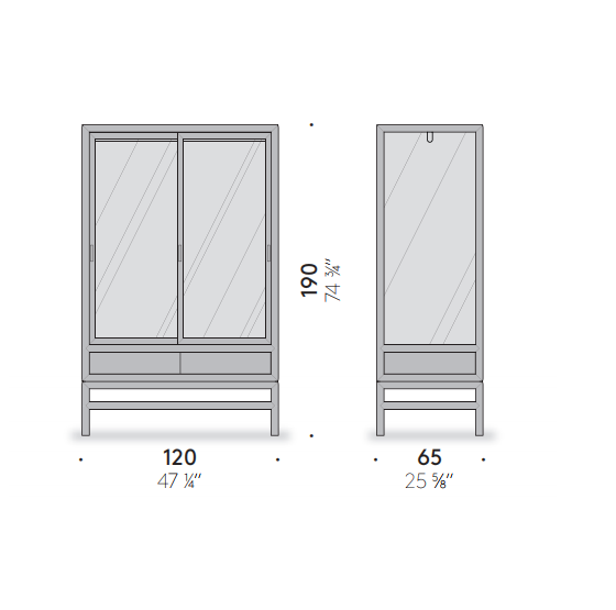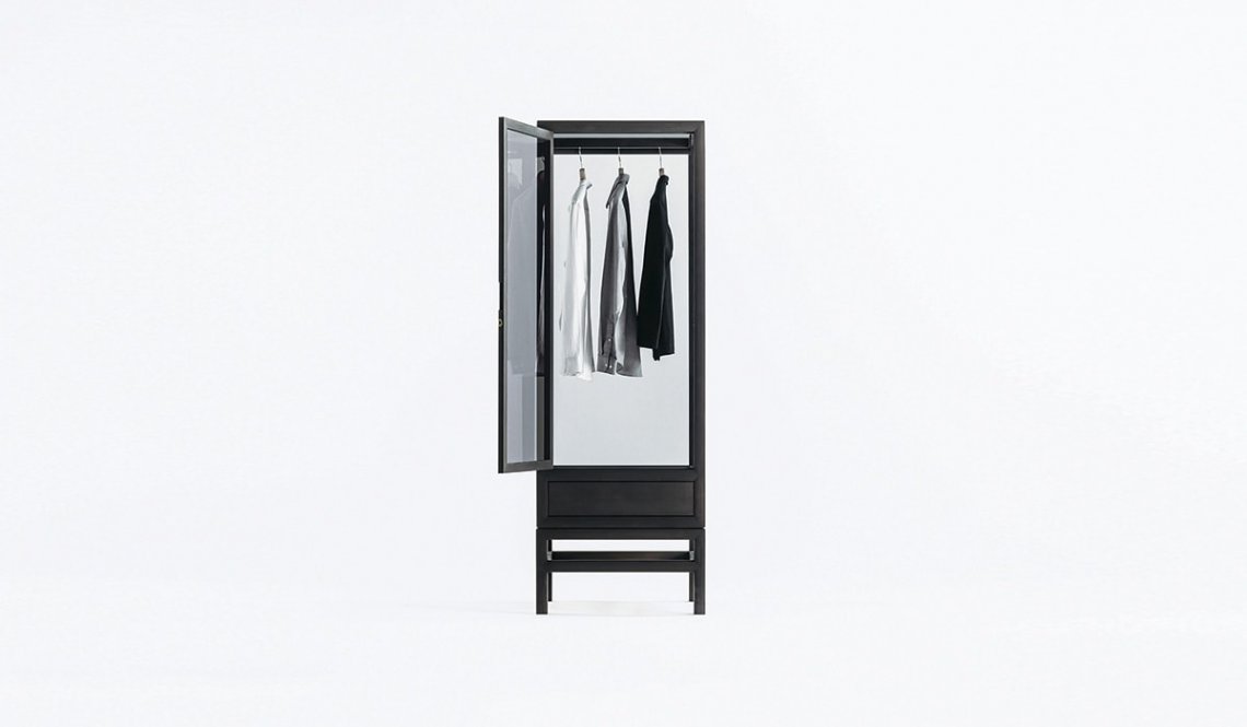 Sliding doors are an element that strongly characterizes traditional Japanese design. We find them in this contemporary double-door interpretation of the classic wardrobe, with drawers on the bottom for small objects and accessories. Also available in single version with hinged door, the wardrobe is made of solid bleached or charcoal gray oak wood.