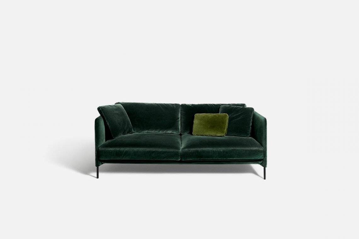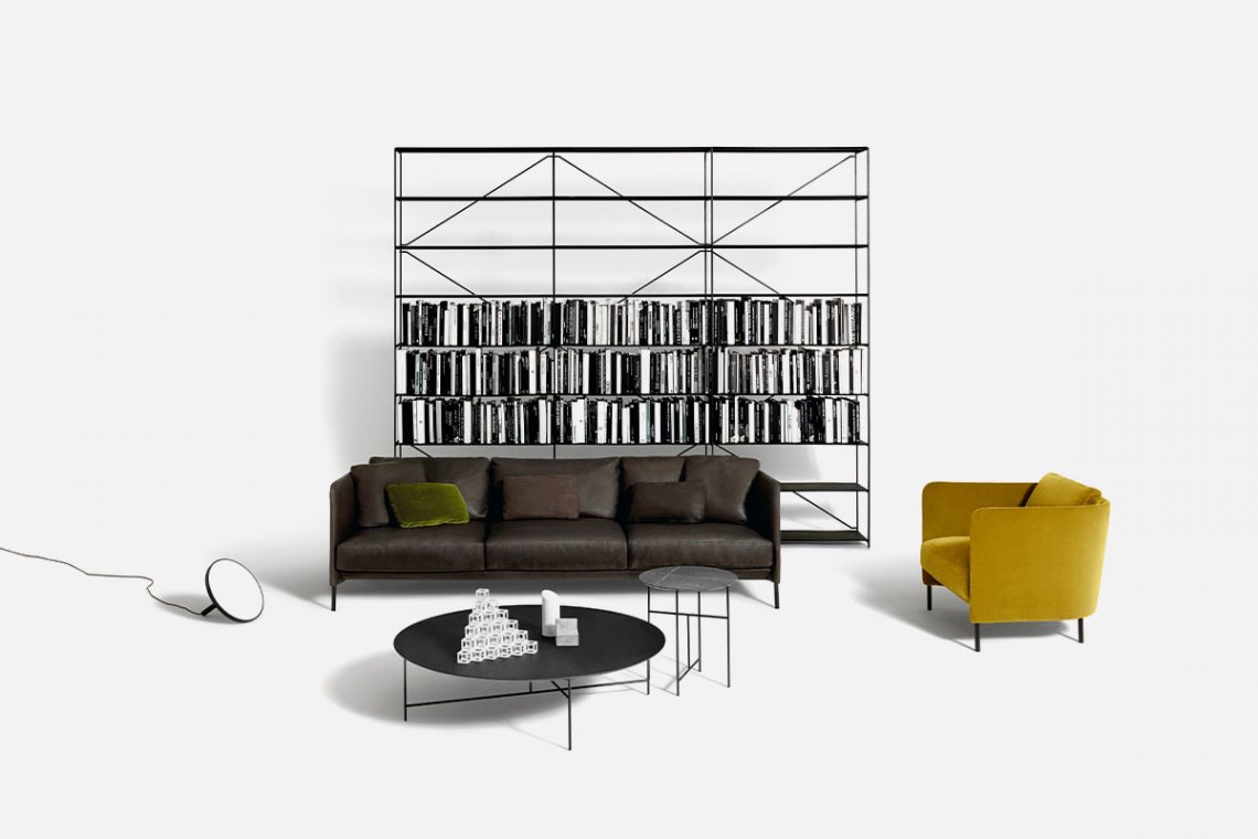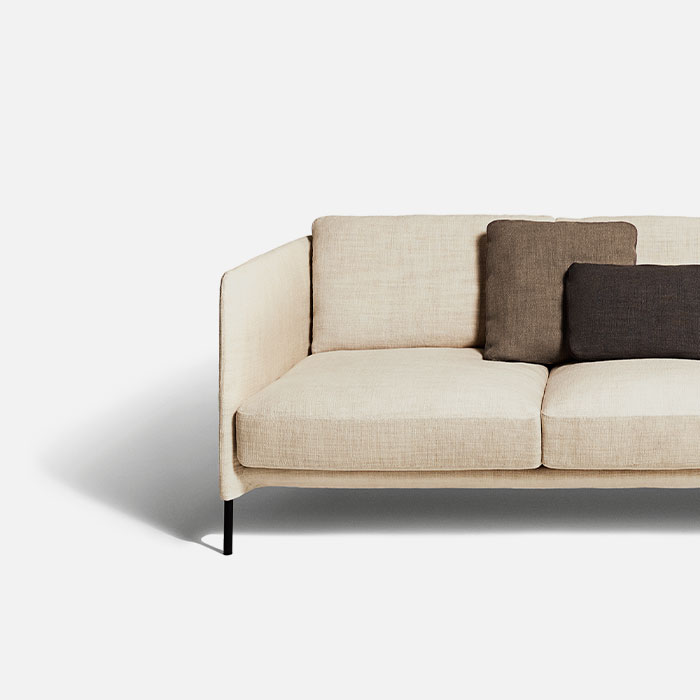 The light lines of designer Omi Tahara have a strong common thread: an enveloping structure that balances the sleekness of the seating. The large cushions are soft and inviting, creating a successful contrast that makes the space particularly comfortable and flexible. An armchair completes the collection.