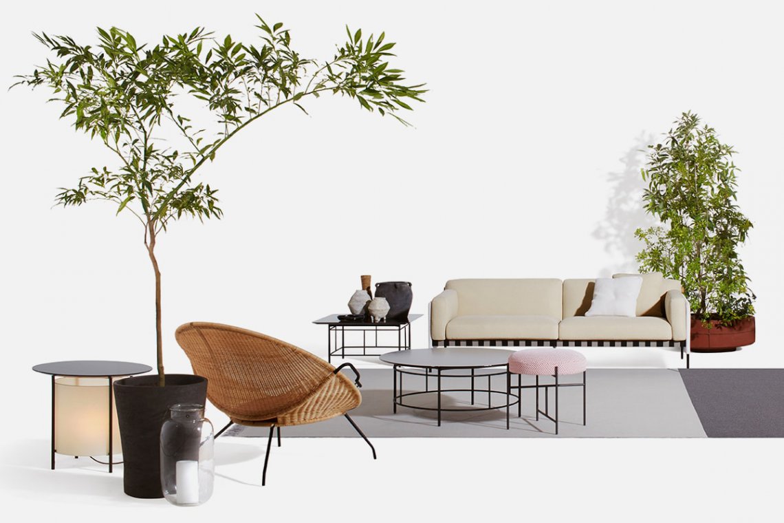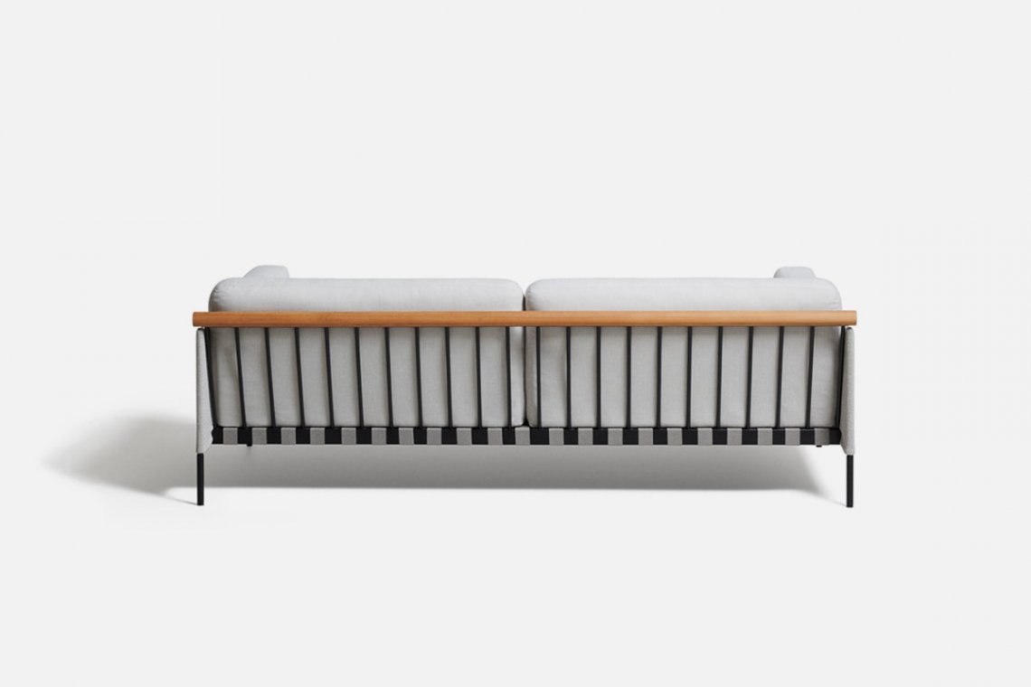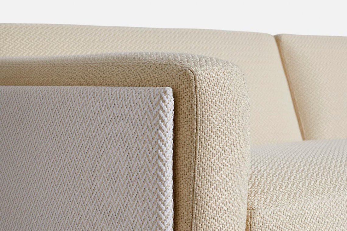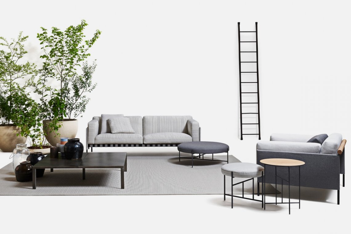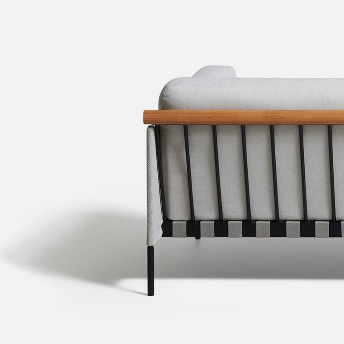 étiquette is a Scandinavian-inspired project that dialogues with superior Italian craftsmanship. Developed by design duo GamFratesi, the model includes a sofa, pouf and armchairs. The indoor piece lends itself perfectly to the outdoors thanks to a selection of finishes. The outdoor version features a body in matte black painted stainless steel that is complemented by elastic straps in a water-repellent fabric and a wood bar in natural teak. The atypical design is simple and essential, making it an excellent solution to mark out a space thanks to its unusual back view. The mood is completed thanks to functional aesthetic elements and refined combinations of precious and resistant yarns in neutral hues. étiquette Outdoor is paired with the Fezzan carpet, which is in Olyna, a recyclable, non-toxic and hypoallergenic water-resistant material that recalls the same natural tones of the armchair, pouf and sofa.