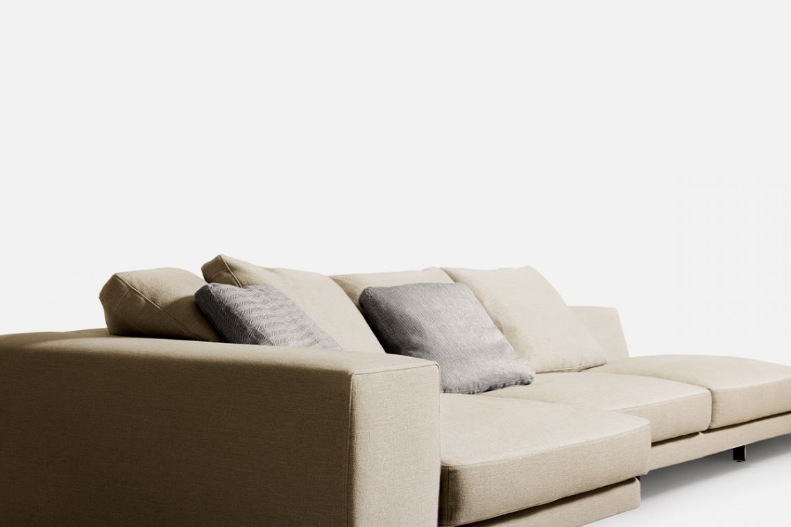 New lines reinterpret the Flying version of the Landscape sofa with the same square silhouette but a thinner seat, lighter frame and higher feet. This novel version is compatible with a series of wood and marble tables, which are perfect when placed next to the sofa in an intermediate, corner or end position or used as a free-standing piece. These new shapes are completed by goose down cushions and pouf that create a welcoming, convivial space.