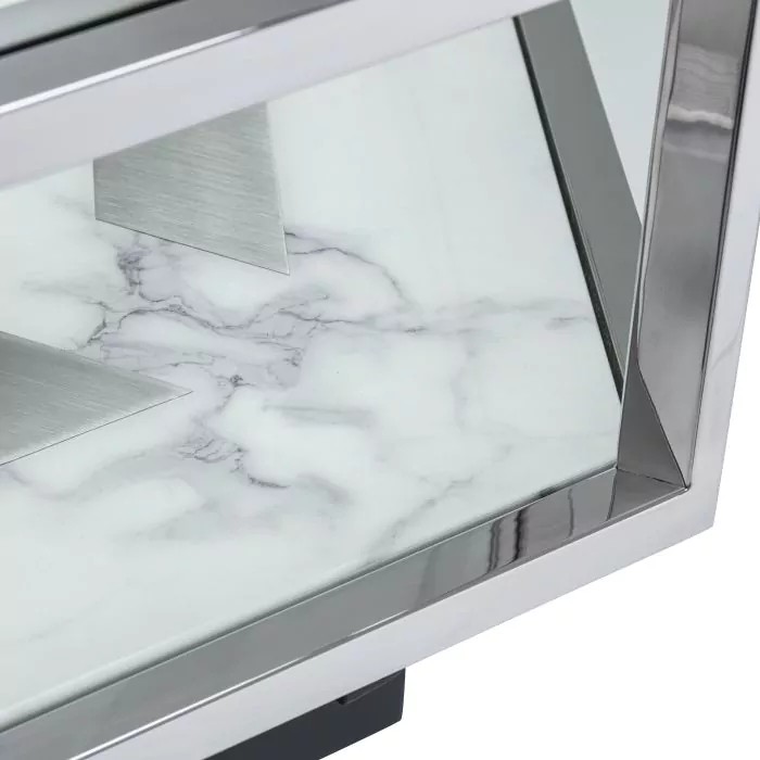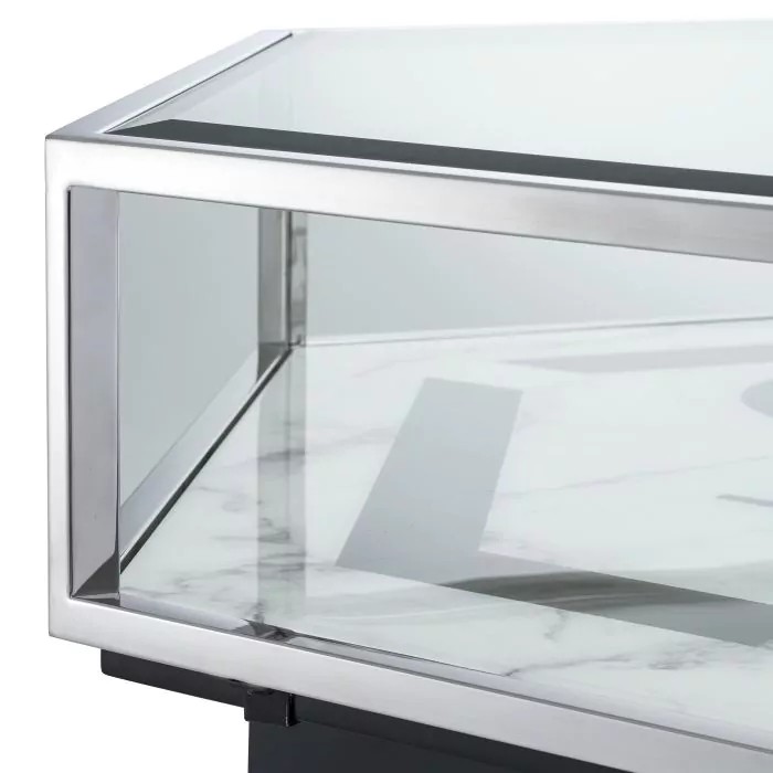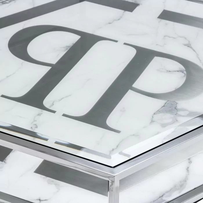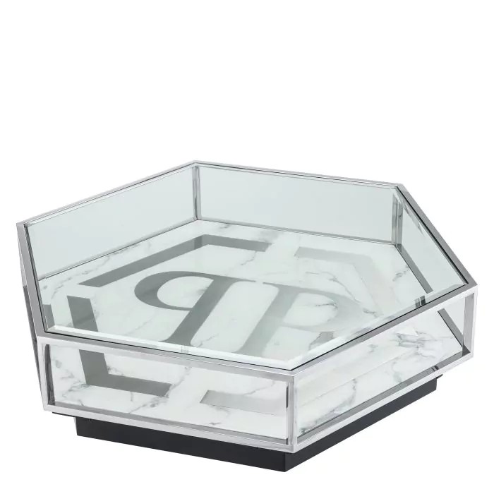 The Falcon View coffee table, with echoes of Italian 70s styling, has been crafted in faux white marble and trimmed with a silver finish and a beveled glass top to draw attention to the Philipp Plein signature hexagon silhouette and logo.