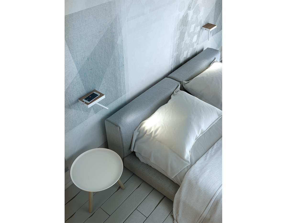 Metallic reading wall lamp with a wooden shelf and a 2 Amp USB charger. Adjustable reading arm with integrated LED and on/off switch on the bottom of the shelf.