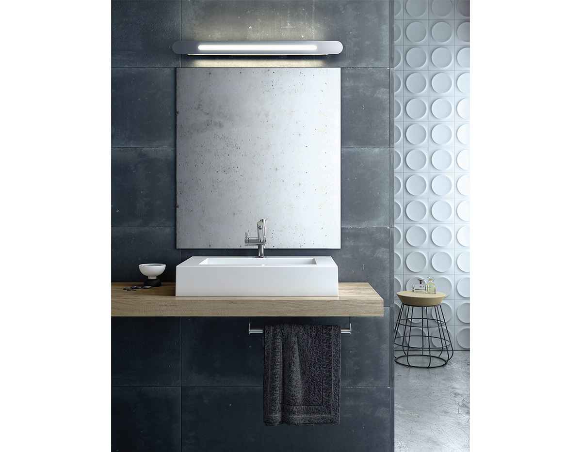 Metallic wall lamp with fluorescent light, compatible with LED bulbs. Front plate with additional cut-out for brighter direct light and acrylic diffuser. It can be mounted vertically or horizontally. The front plate allows laser-cut signage with custom creations including ideograms, logos and texts.