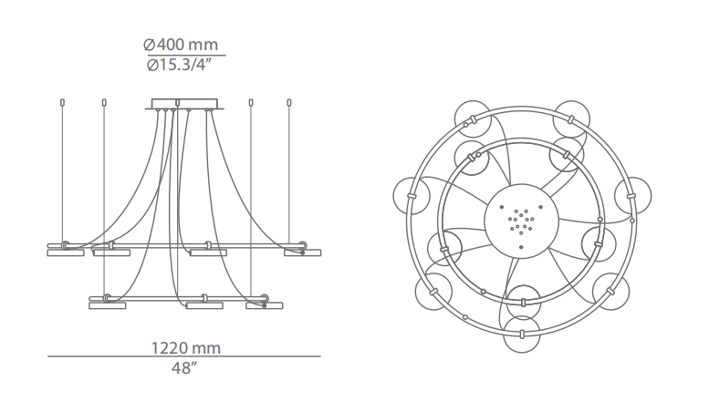 Metallic suspension lamp with circular adjustable heads and acrylic diffusers. The heads rotate up to 106o. The lamp can be mounted with all heads facing up or all heads facing down. Adjustable height and integrated LED dimmable 0-10V. In the composition R40.1M1L each lamp is dimmable independently and each one can be mounted with heads facing up or down.