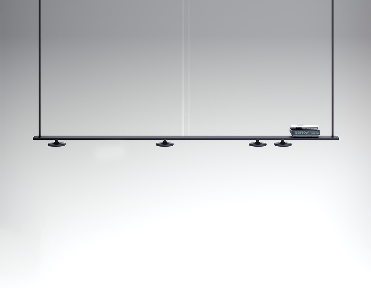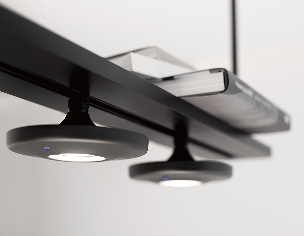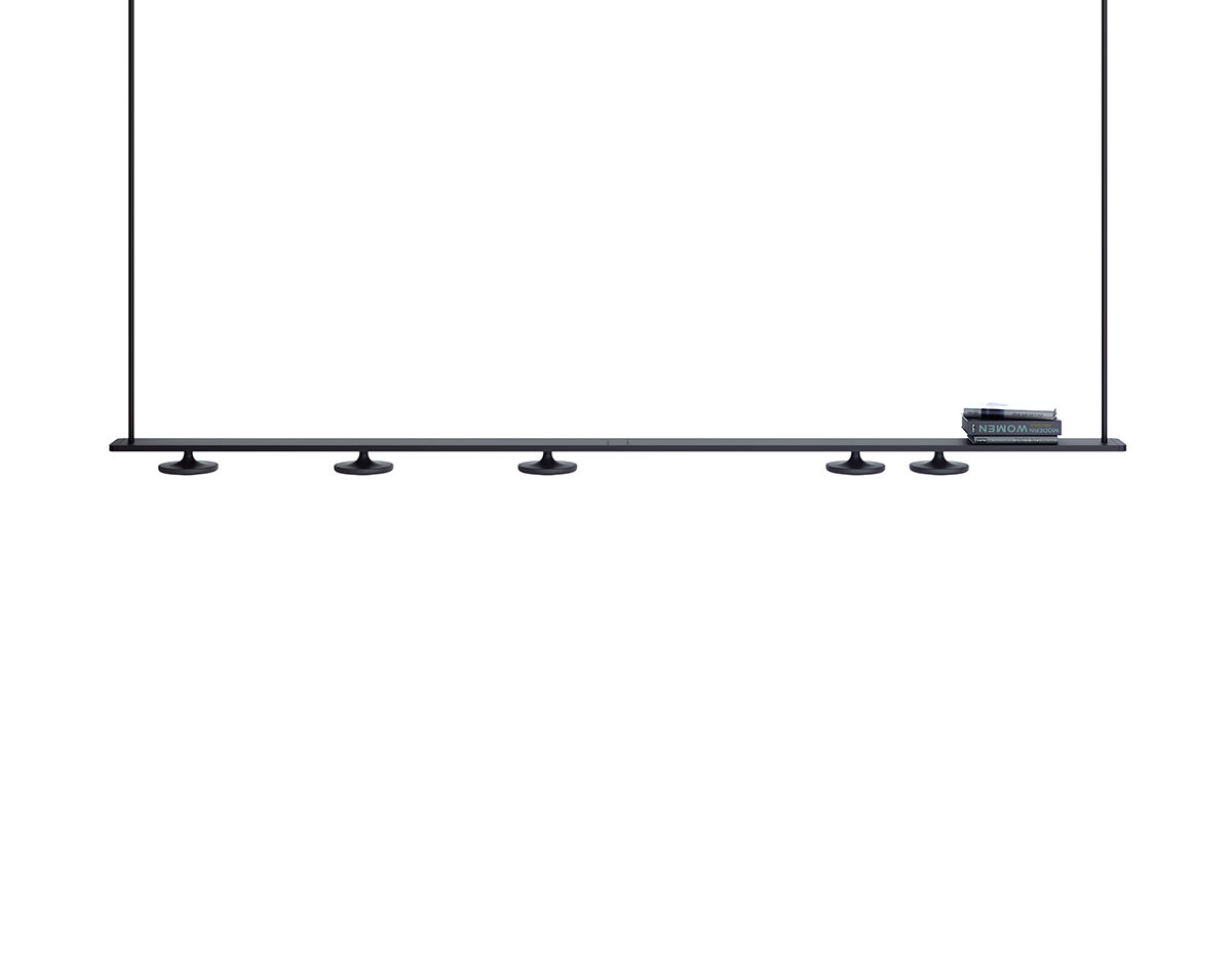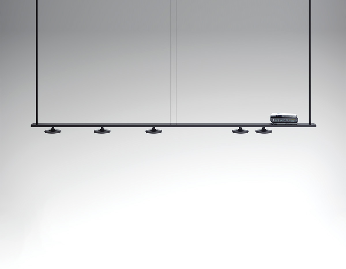 Suspension lamp with track system with aluminium shades that can be placed anywhere along the track. Height adjustable. Integrated LED on each shade that and can be dimmable, turned on and off independently by a touch sensor. Display favourite objects or books on Button’s topside shelf. Safely holds up to 30Kg / 65lbs.
