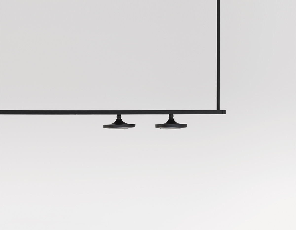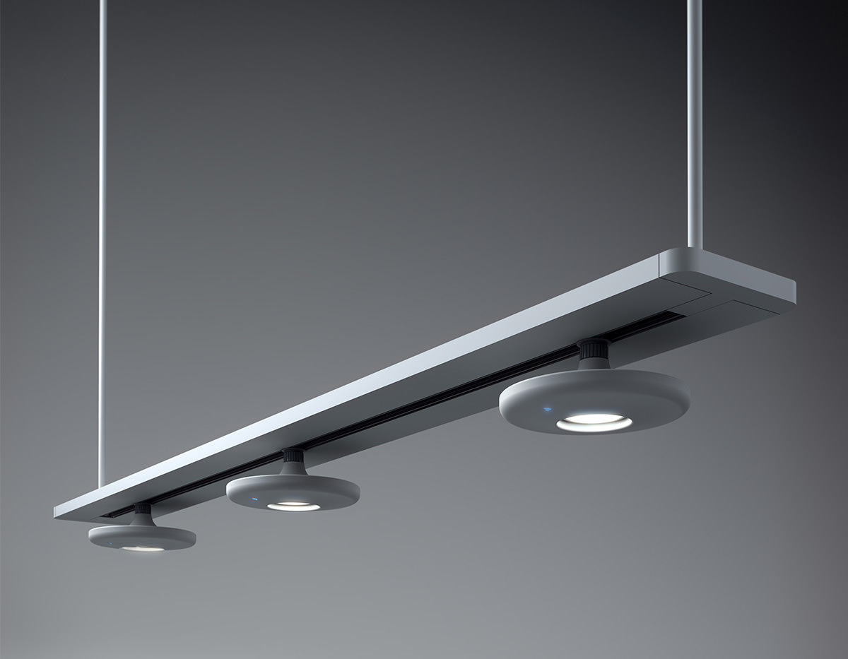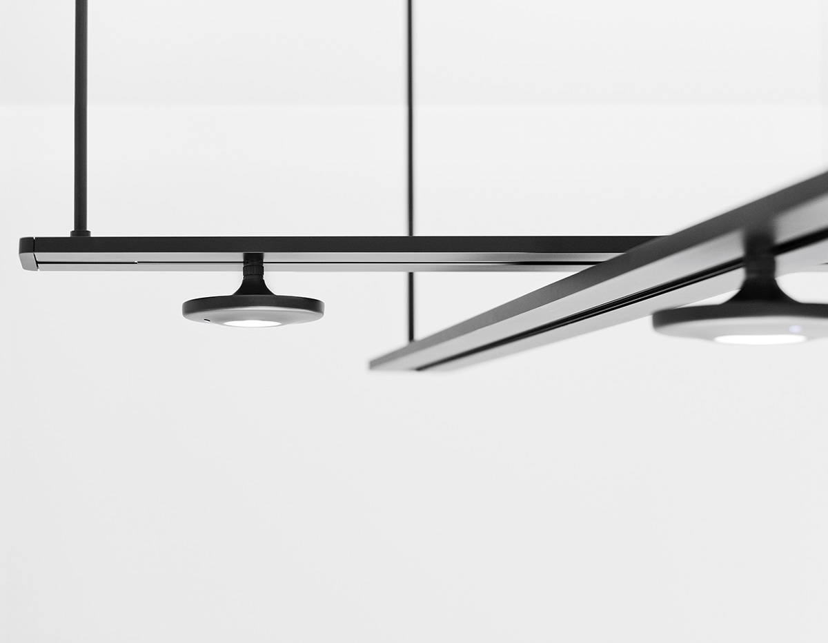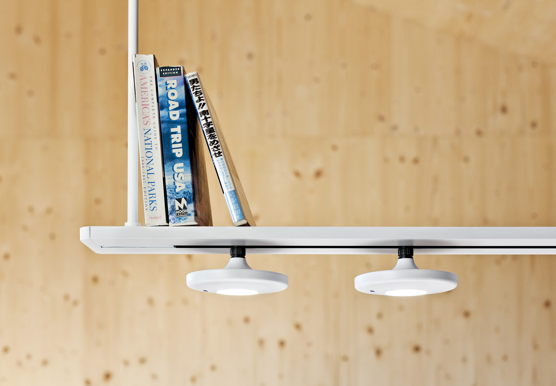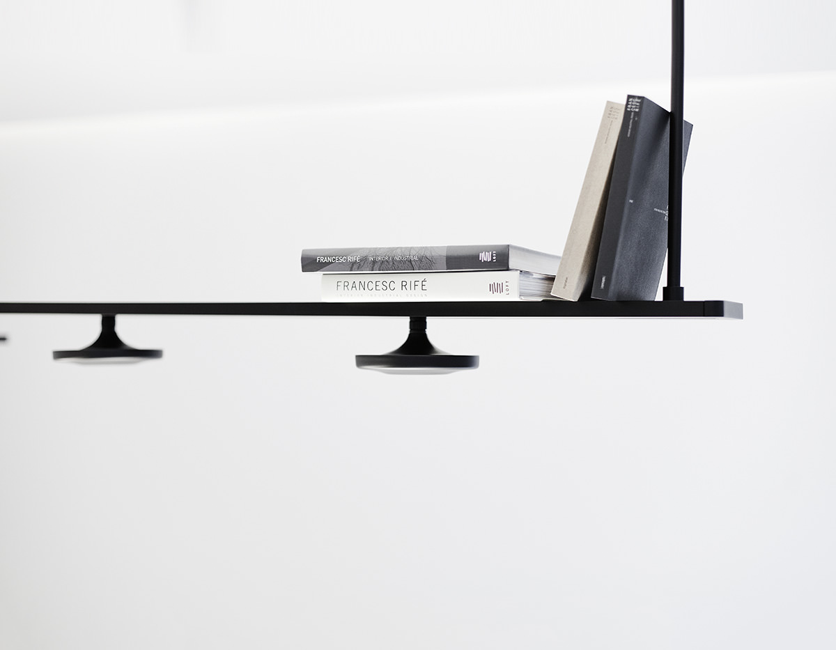Suspension lamp with track system with aluminium shades that can be placed anywhere along the track. Height adjustable. Integrated LED on each shade that and can be dimmable, turned on and off independently by a touch sensor. Display favourite objects or books on Button’s topside shelf. Safely holds up to 30Kg / 65lbs.