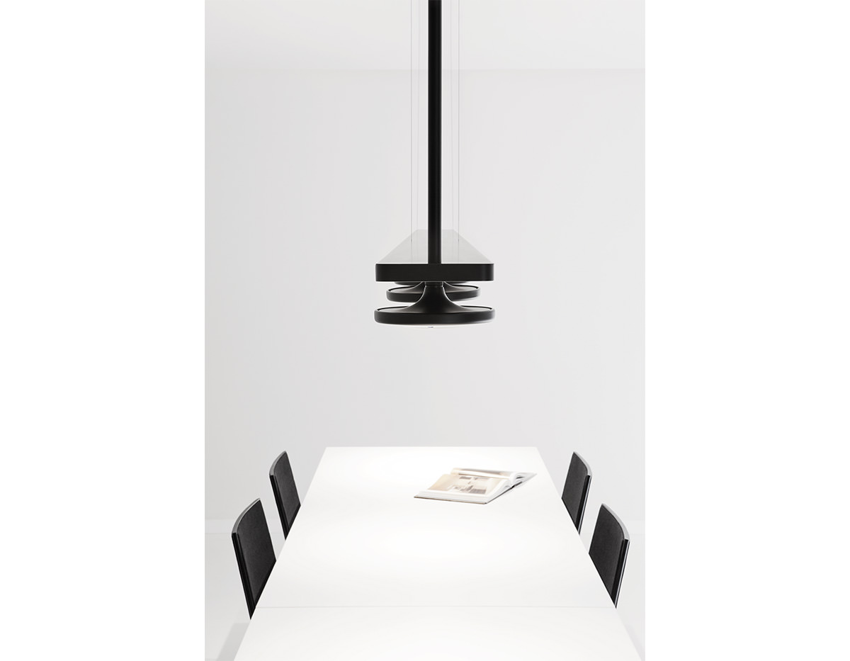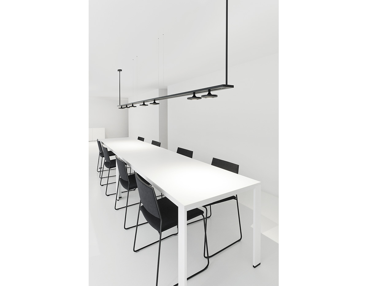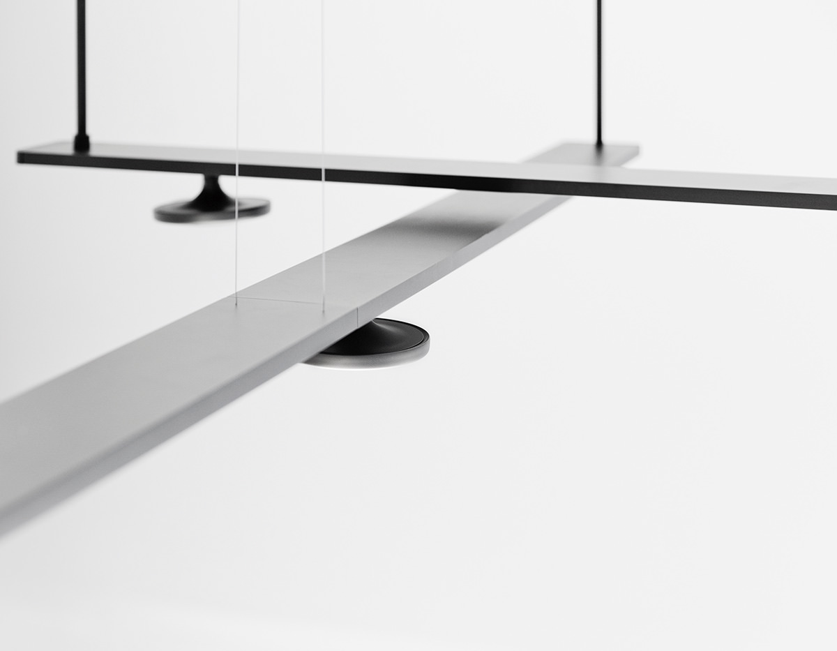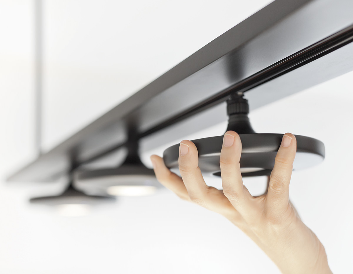 Suspension lamp with track system with aluminium shades that can be placed anywhere along the track. Height adjustable. Integrated LED on each shade that and can be dimmable, turned on and off independently by a touch sensor. Display favourite objects or books on Button’s topside shelf. Safely holds up to 30Kg / 65lbs.