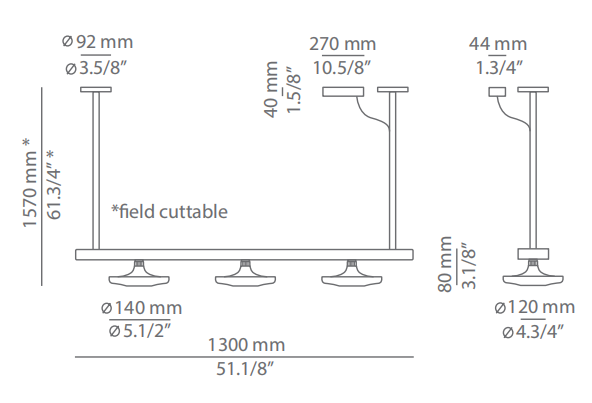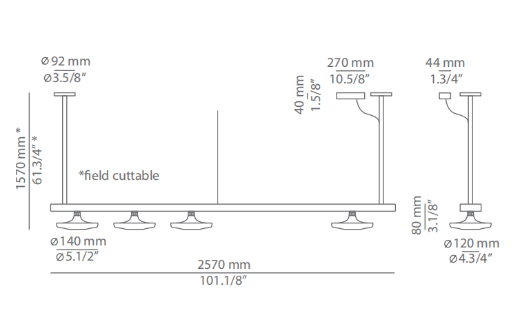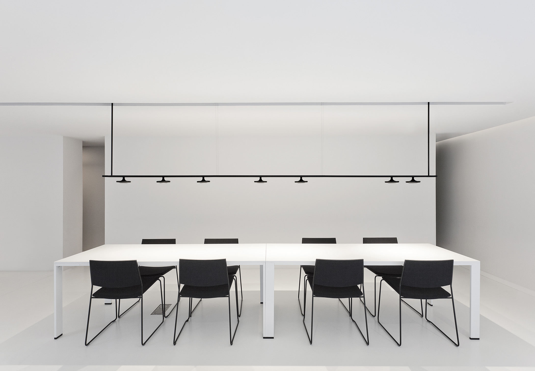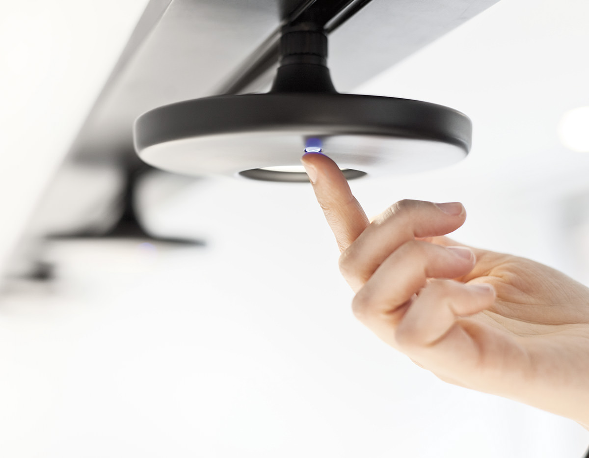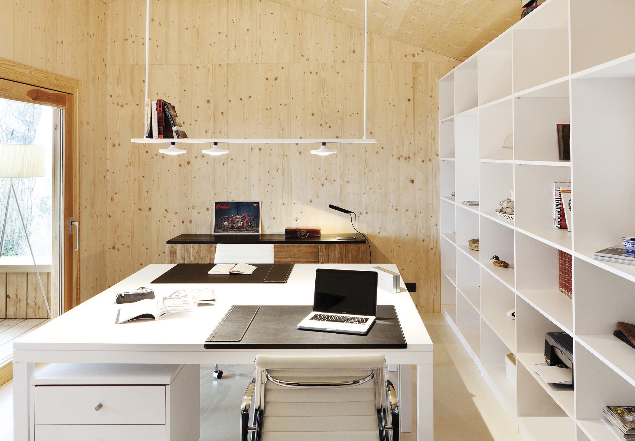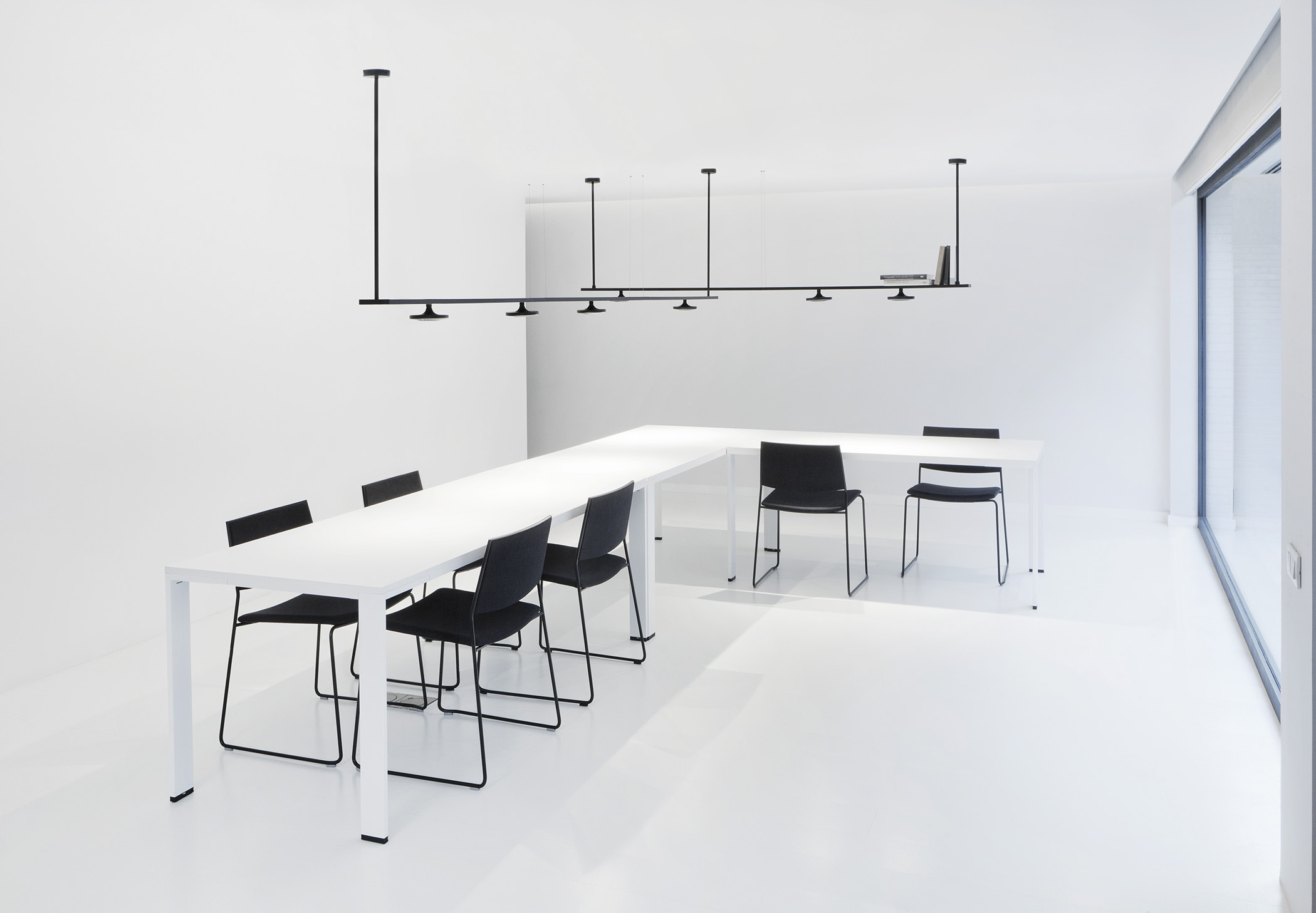 Suspension lamp with track system with aluminium shades that can be placed anywhere along the track. Height adjustable. Integrated LED on each shade that and can be dimmable, turned on and off independently by a touch sensor. Display favourite objects or books on Button’s topside shelf. Safely holds up to 30Kg / 65lbs.