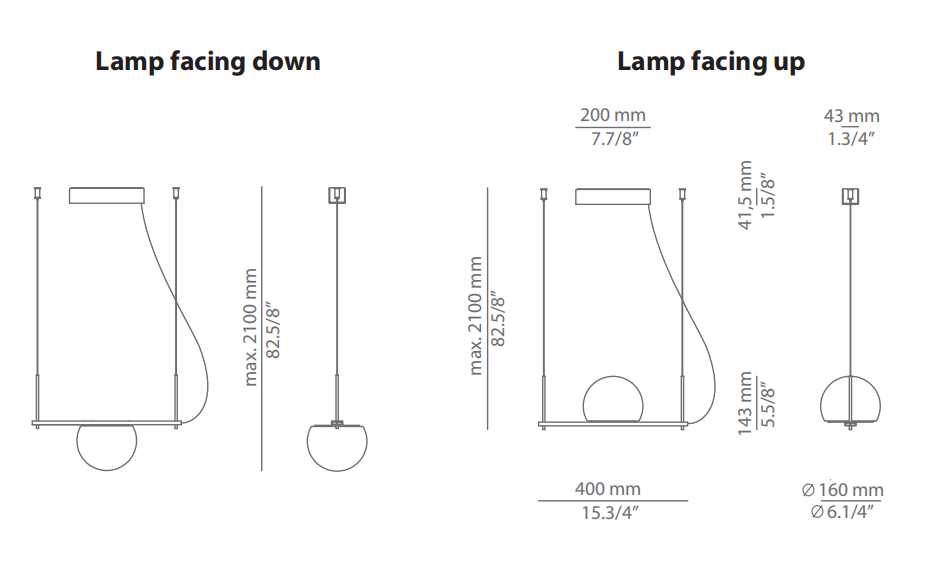 Metallic suspension lamp providing direct and indirect light. Glass shades and integrated dimmable LED. Adjustable height and can be mounted facing upwards or downwards.