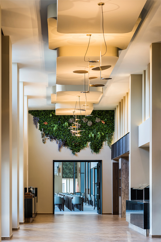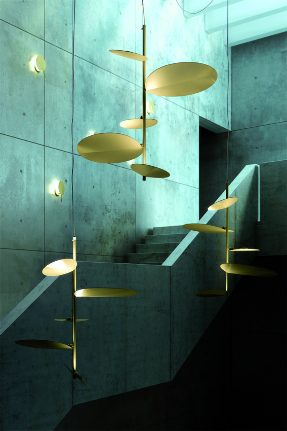 Metallic suspension lamp with adjustable height and integrated dimmable LED providing indirect light.