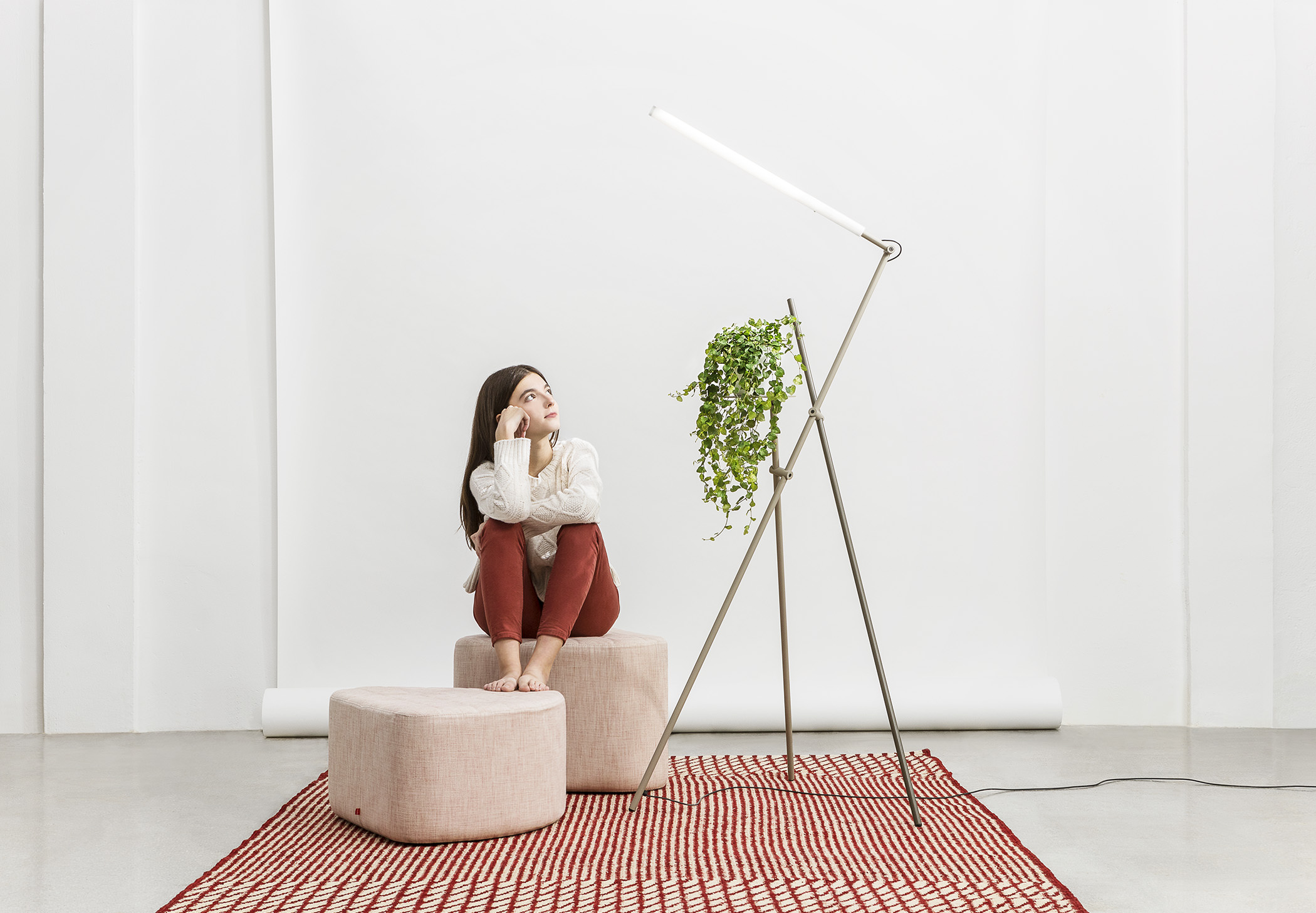 Metallic floor lamp with three multifunctional arms. Direct and indirect light provided by an adjustable arm with acrylic diffuser and integrated dimmable LED on the stem. Accessories can be added to the stems such as a table or magazine holder.