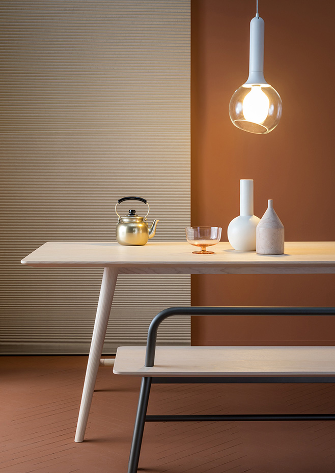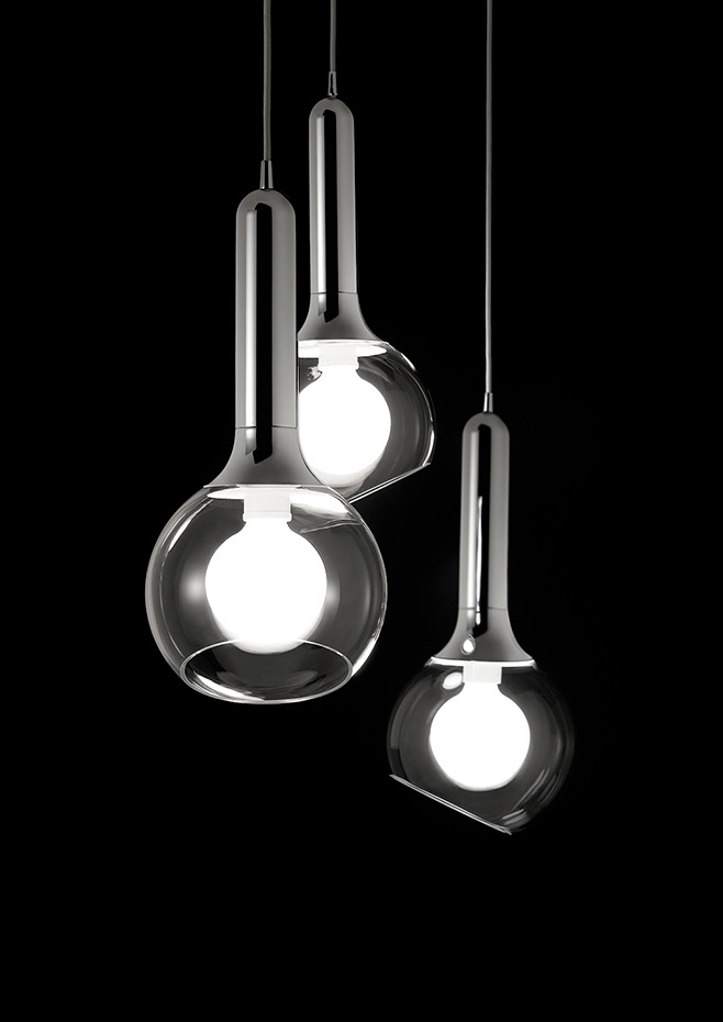 Metallic pendant with a transparent glass globe cut diagonally on the bottom and decorative bulb. Adjustable height and individual canopy, suitable for creating compositions.