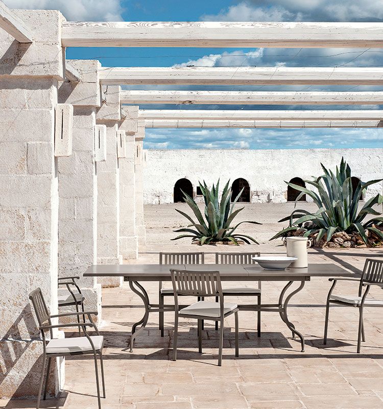 This furniture collection, inspired by classic design yet ready to meet all contemporary outdoor living needs, displays a timeless style with a complete and coordinated range, from seats to tables and accessory items.