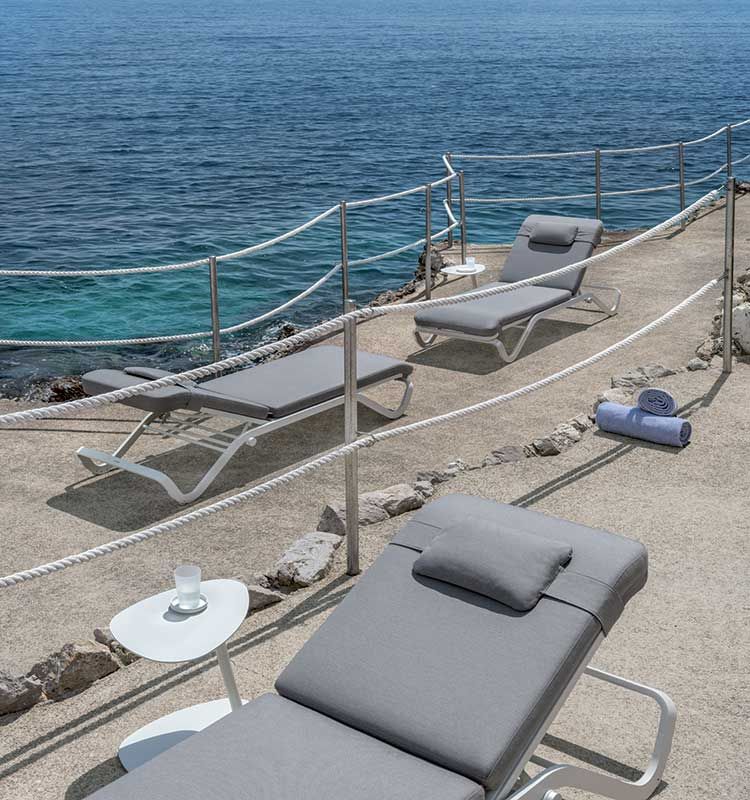 Essential and sophisticated, the metal structure of the Ocean sun loungers takes on soft shapes like the waves of the sea. The stackability of each element emphasizes the functionality