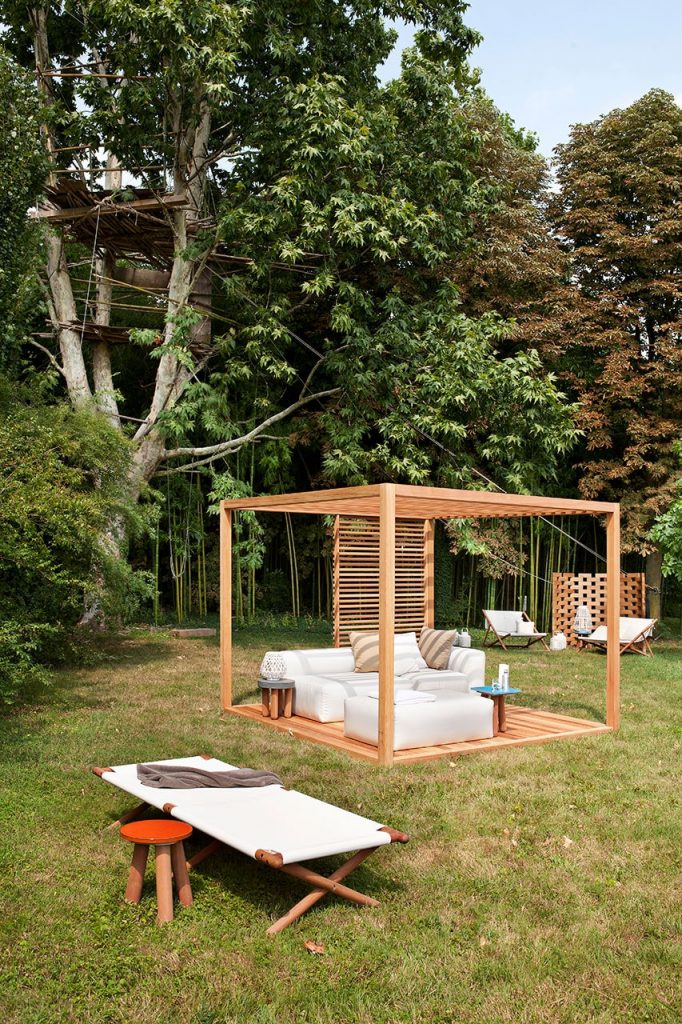 The frame of the elegant sunbed is handmade in solid Sapelli mahogany. Available in fabric and treated leather for outdoor use, it can be equipped with the soft "Comfort" cushion.