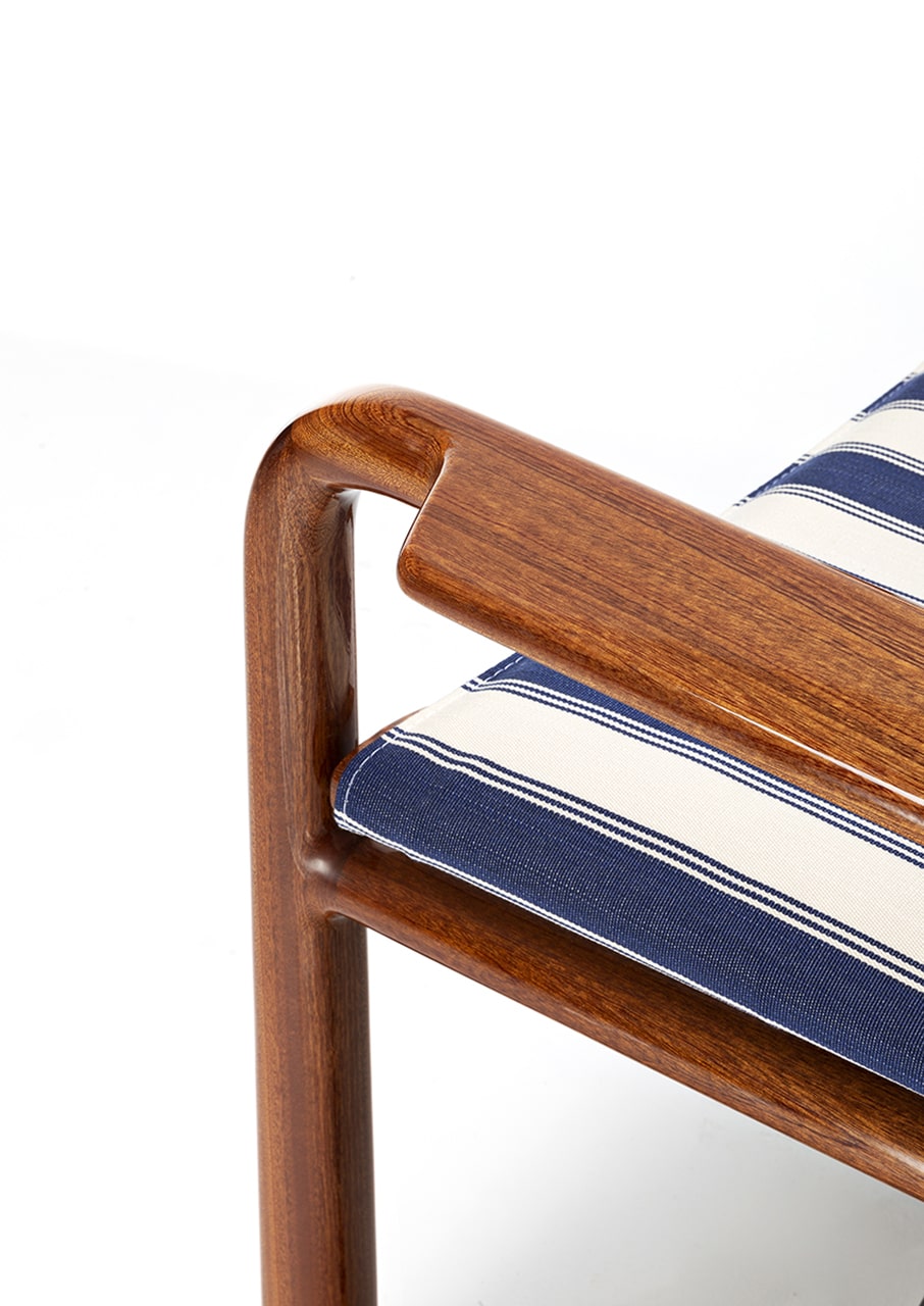 An encounter beween wood and fabric gives life to a chair with languid outlines and a Mediterranean flavor.
