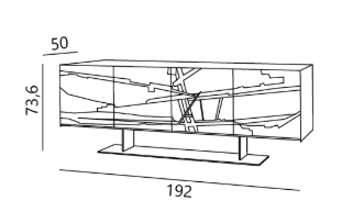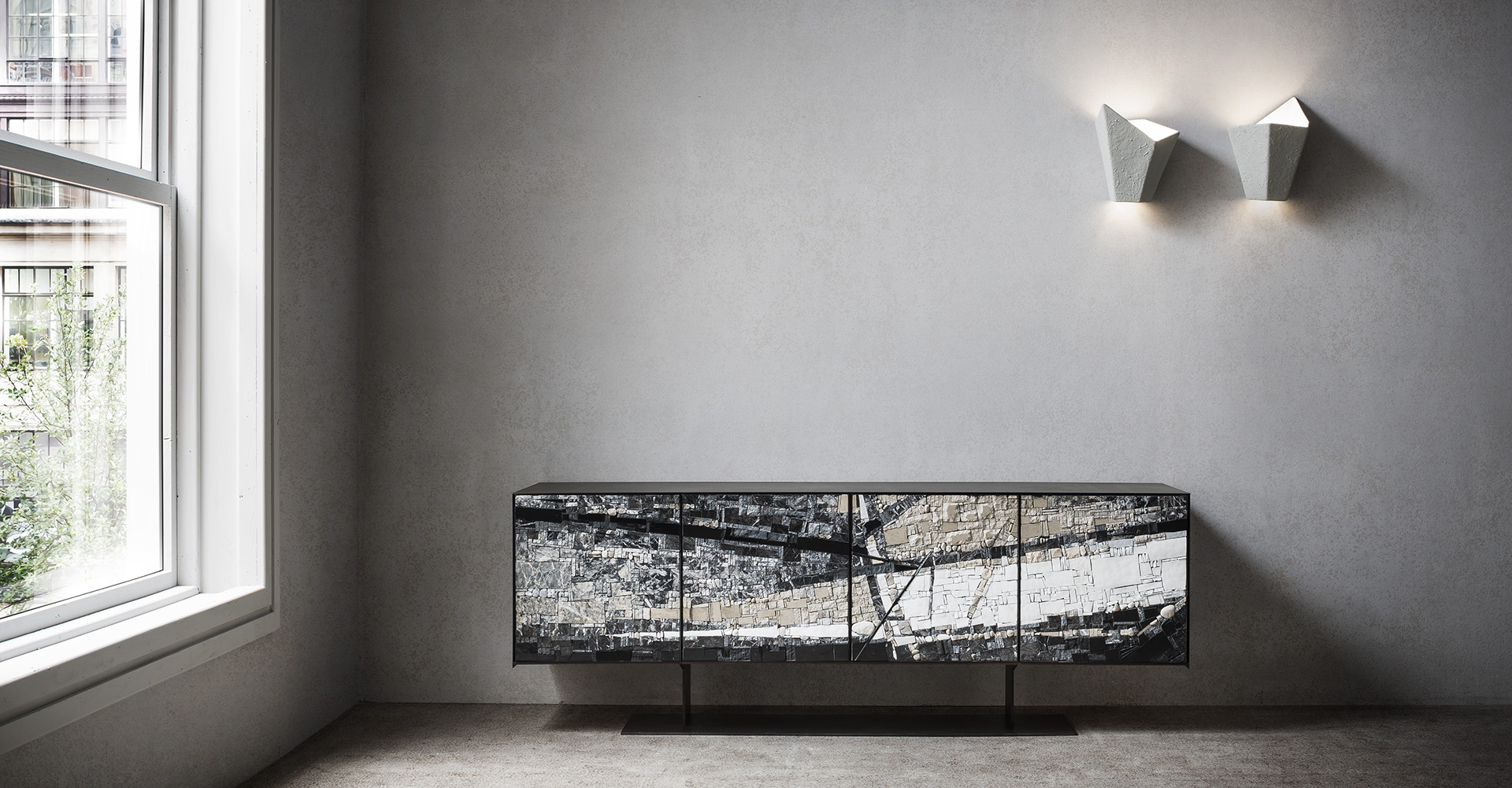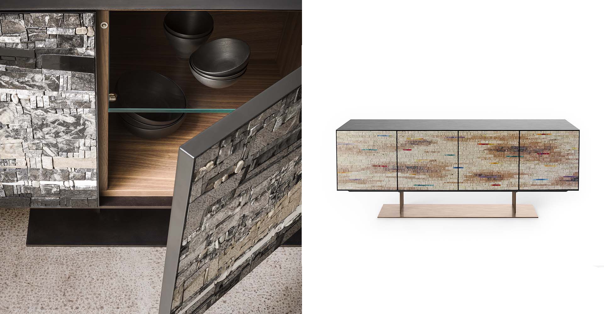 Simplicity and brilliance characterize this sideboard with hypnotic charm, which has a rectangular structure and minimal metal base, with four doors available in the precious variants Exclusive Mosaic, "Terra" Mosaic, "Terrazzo Veneziano" or Clay and an interior in canaletto walnut veneer with glass shelves in extra clear. The mosaics come from the famous Mosaicisti del Friuli di Spilimbergo international school. The subjects represented are details taken from well-known artistic masterpieces. The "Terrazzo Veneziano" derives from the original technique used in the flooring often used in Venetian palaces, which already in ancient Greece was used in floor and wall coverings. The clay coatings are made with pure clay and binder resins.
