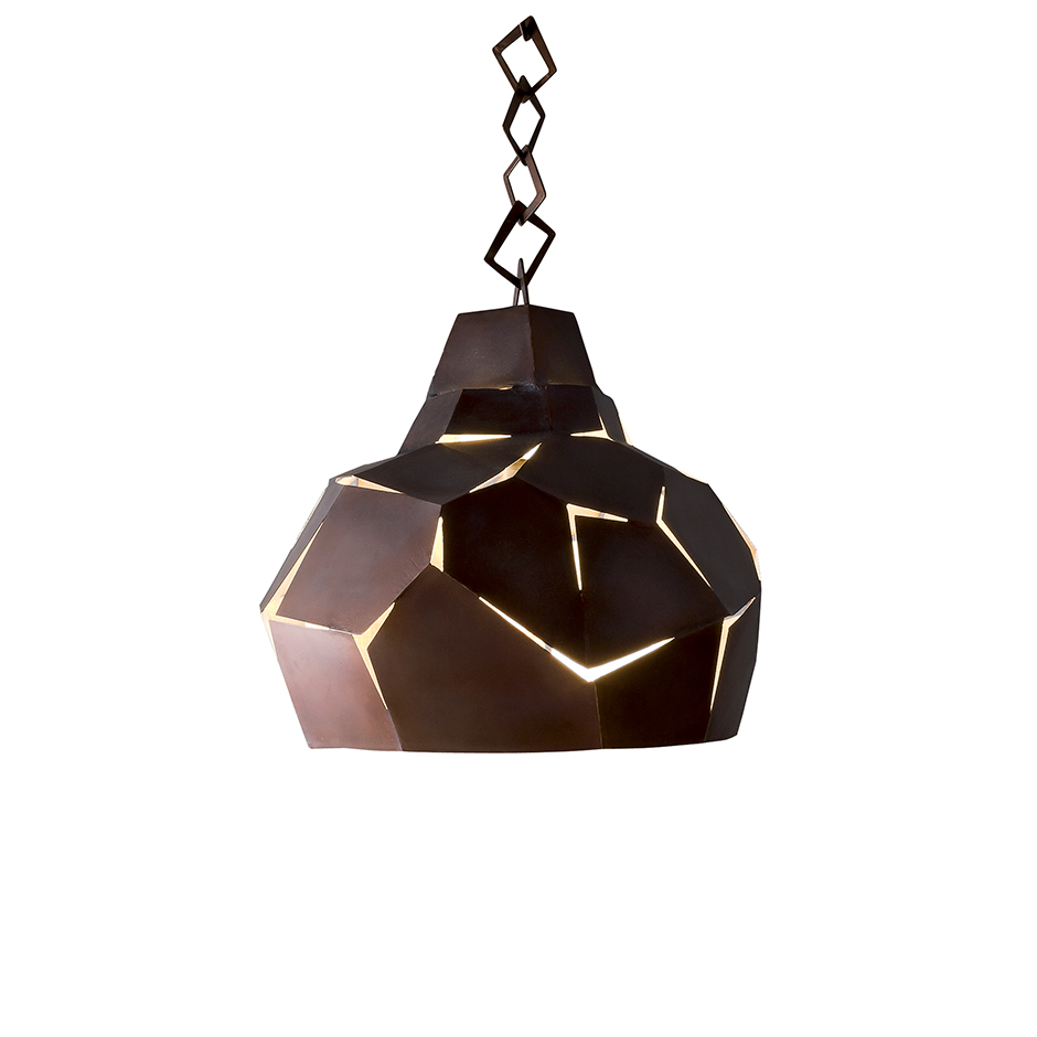 Asymmetrical light cuts spread in all directions, enhanced by the luster of the gold leaf that covers its interior. EKFLAMO is a suspension lamp in metal obtained from a bent and welded metal sheet, available externally in nickel, bronze, brass or lead diamond metal finishes or in manual burnished etched finish.