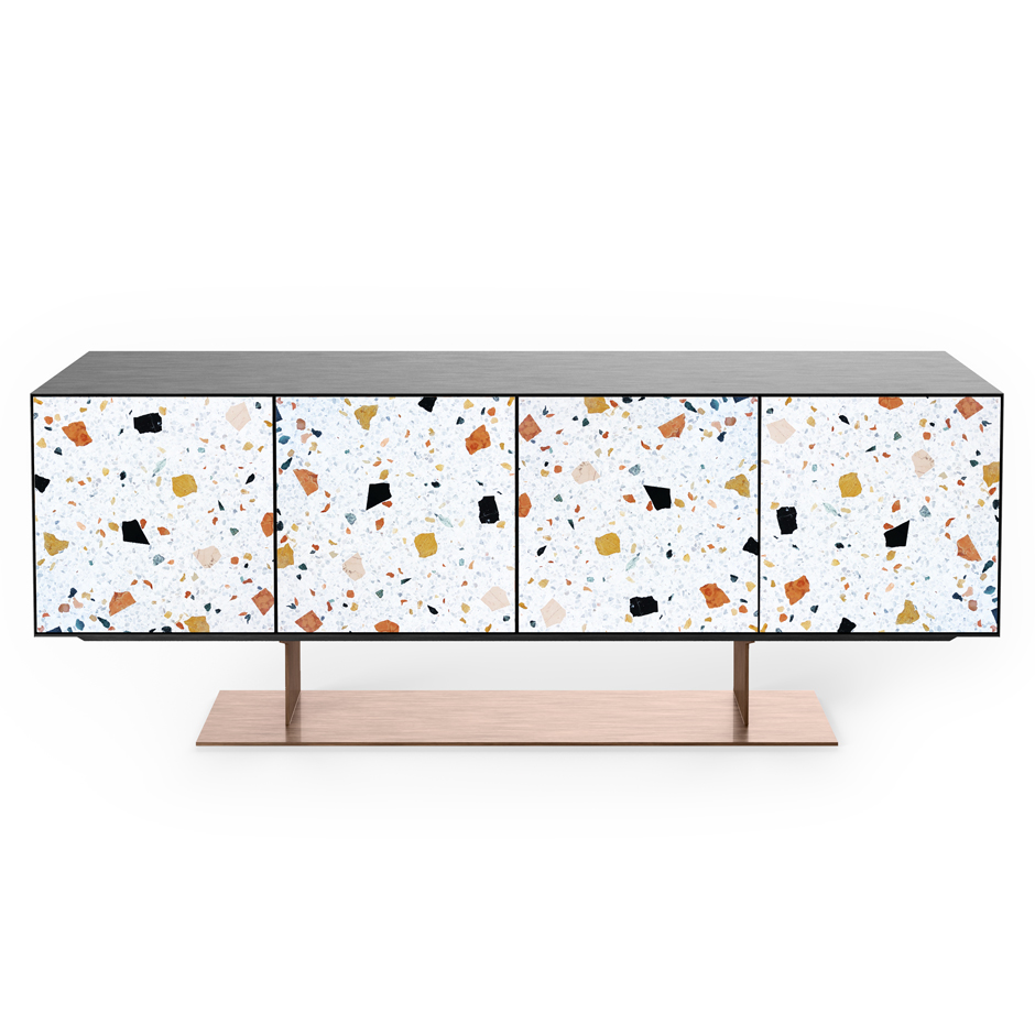 Semplicità e lucentezza caratterizzano questa madia dal fascino ipnotico, che presenta una struttura rettangolare e la base minimale in metallo, con quattro ante disponibili nelle preziose varianti Mosaico Exclusive, Mosaico Terra, Terrazzo Veneziano o Argilla e un interno in impiallacciato noce canaletto con ripiani in vetro extrachiaro. I Mosaici sono provenienti dalla famosa scuola internazionale Mosaicisti del Friuli di Spilimbergo. I soggetti rappresentati sono particolari tratti da noti capolavori artistici. Il terrazzo veneziano deriva dalla tecnica originale usata nella pavimentazione spesso usata nei palazzi veneziani, che già nell’antica Grecia veniva utilizzata nei rivestimenti di pavimenti e pareti. I rivestimenti in argilla sono realizzati con pura argilla e resine leganti.