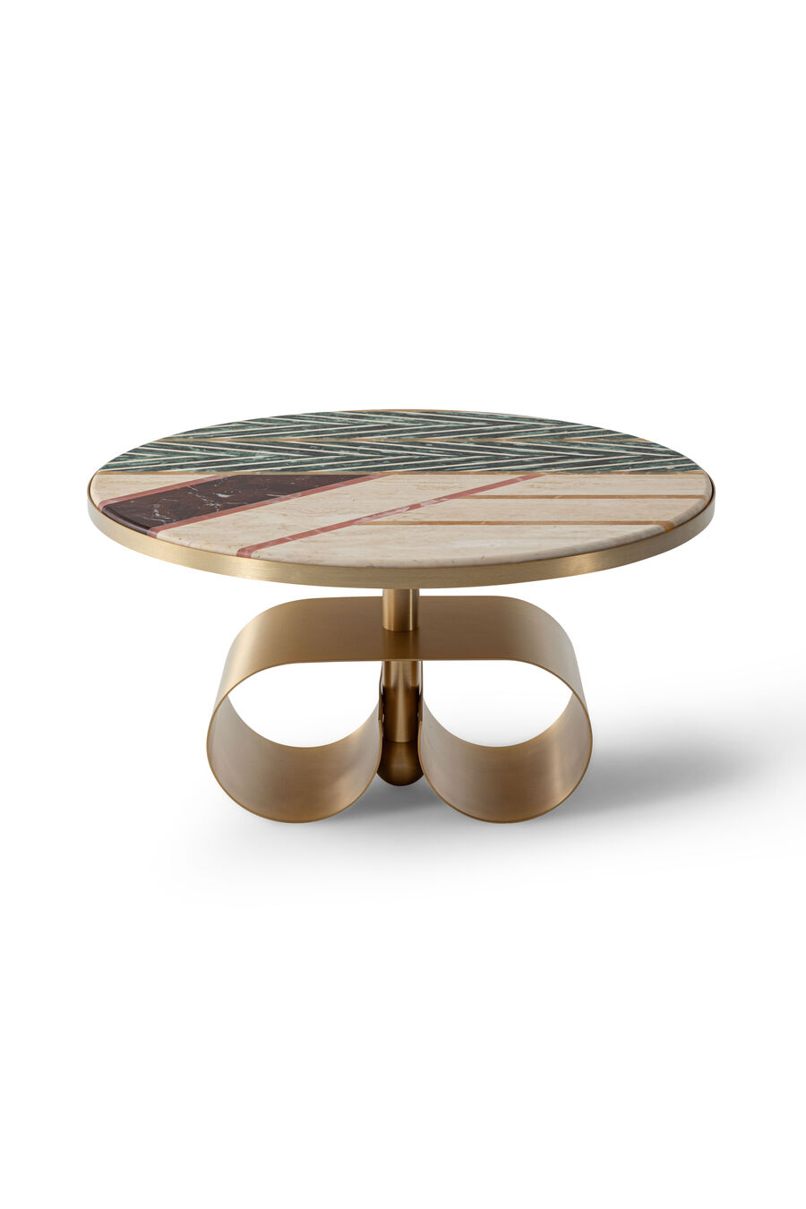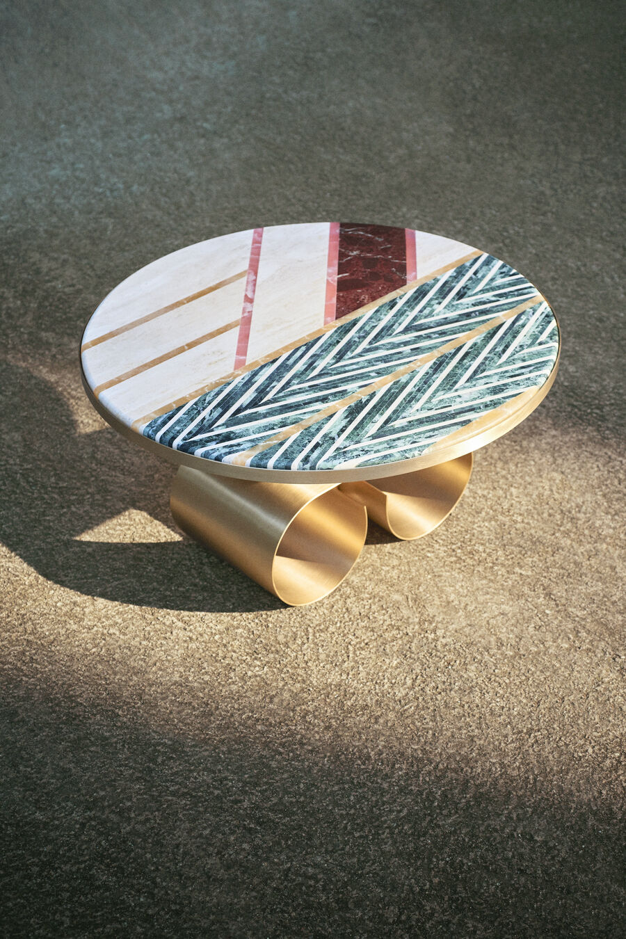 This diminutive design gem by Cristina Celestino is a celebration of femininity and Fendi’s hallmark timeless elegance. Comprising a circular marble top and steel base in brushed gold steel, Earring is a fascinating contrast of materials that combine to create a sophisticated yet visually light aesthetic. Available in two different heights and top sizes and a selection of finishes and types of marble.