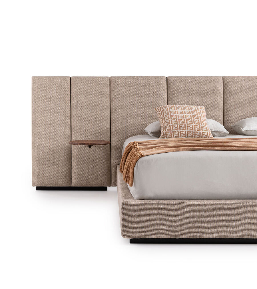 A unique highlight piece, the Delano Dressed double bed brings a new dimension to the bedroom. The spectacular oversize headboard that defines the design with its commanding volumes is updated with integrated side tables, available in either wood or bubble glass. Sleek metal tubular details, enriched with the iconic FF motif, create a visually impactful materic contrast – the result is a statement piece for private homes and luxury hospitality.