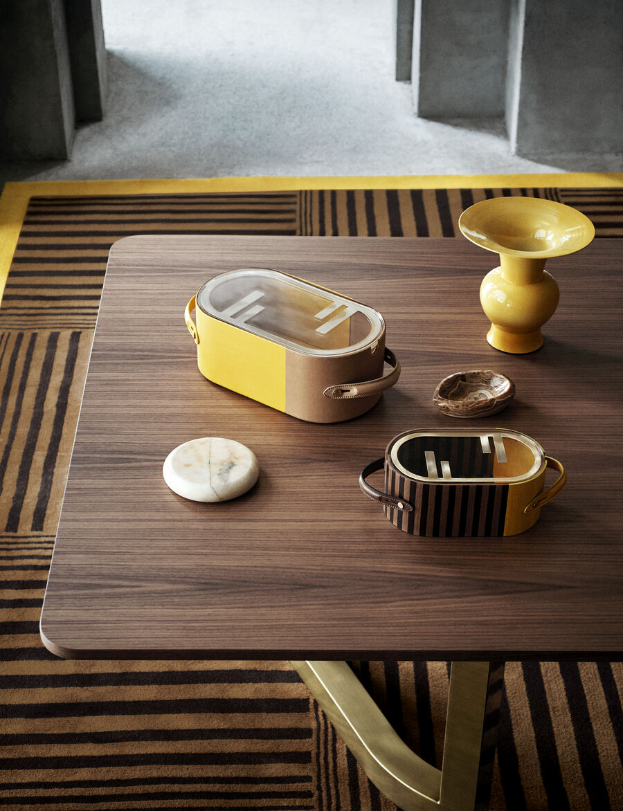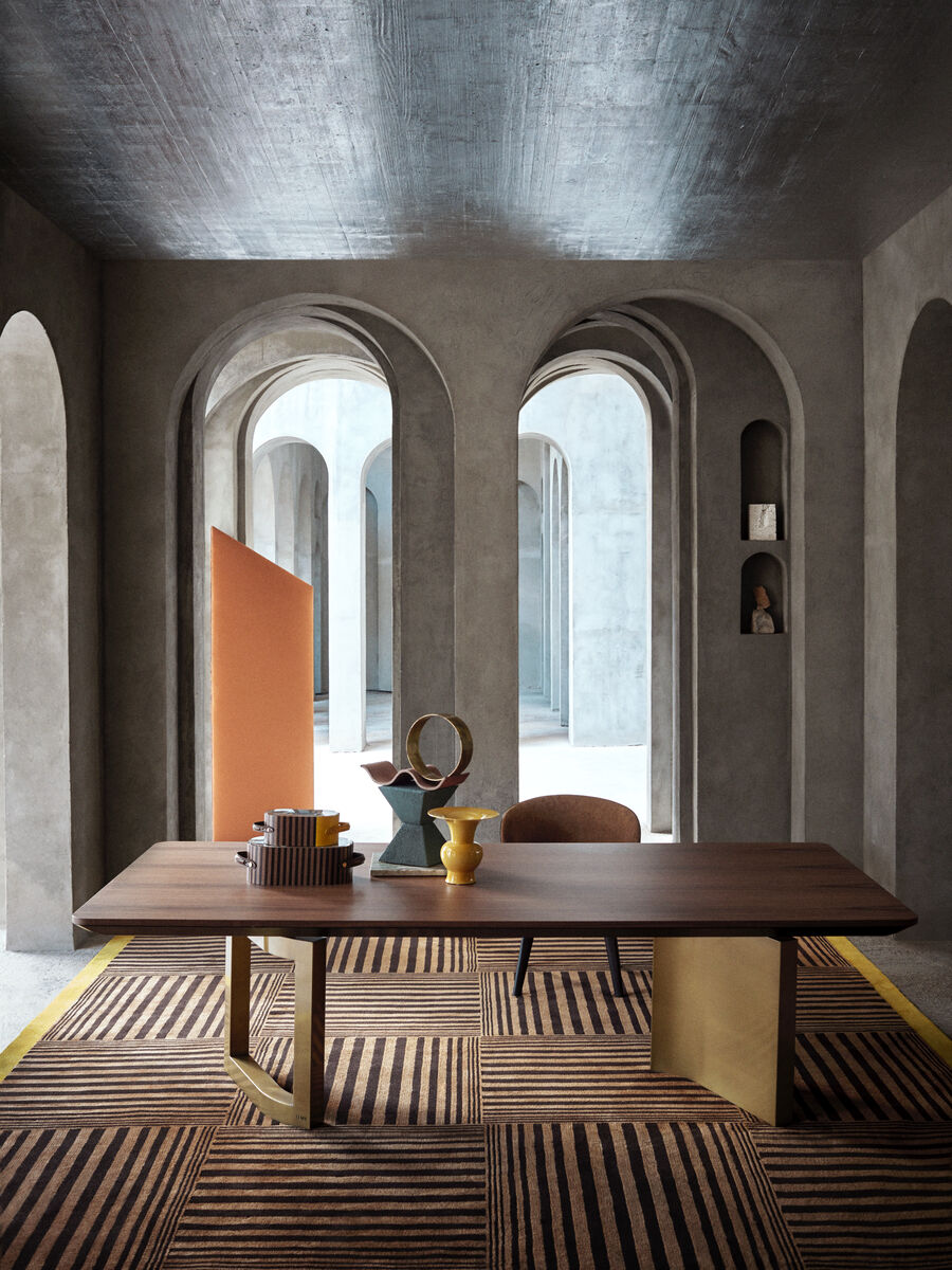 The Tiles rug is an original expression of an iconic geometric pattern with a motif inspired by the classic Fendi Pequin stripes. Mohair and botanic silk are handwoven with meticulous skill to create an exquisitely soft texture. A border in a contrasting block colour frames a striking aesthetic that is perfect for the living room or entrance way.