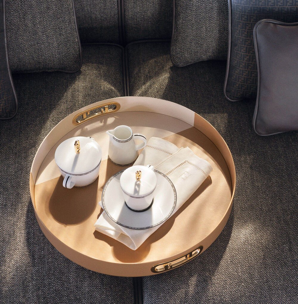 The Fendi O’Lock series of trays is inspired by the iconic Fendi jewellery collection. The distinctive oval form is introduced in the form of metal handles that transform a simple tray into a stylish object of design. The pleasing geometry of circular and oval curves in natural materials such as leather and wood is showcased by a striking colour block effect or the classic Pequin striped motif.