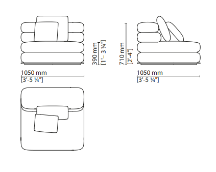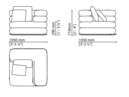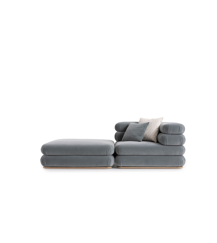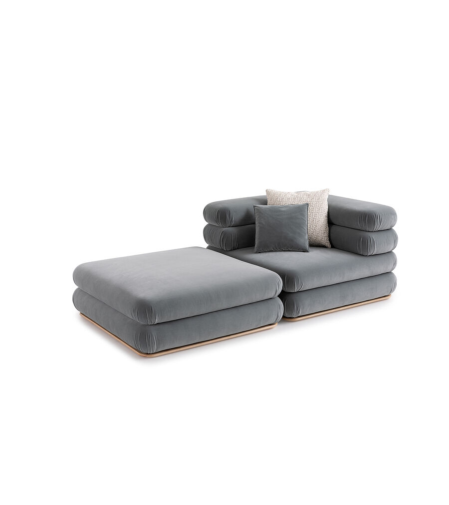 Featuring a broad, comfortable shape, the Blow Up sofa by Controvento combines iconic elements and transforms them into contemporary design. Seats and backrests effortlessly combine into modular volumes: smooth forms, as if shaped by the wind, alternate Pequin-striped seating with sartorial-inspired pleated details. The substantial wooden base lifts the sofa off the ground, enhancing the feeling of lightness and support.