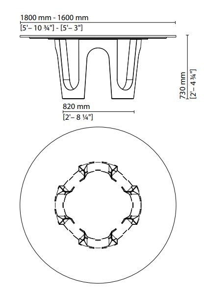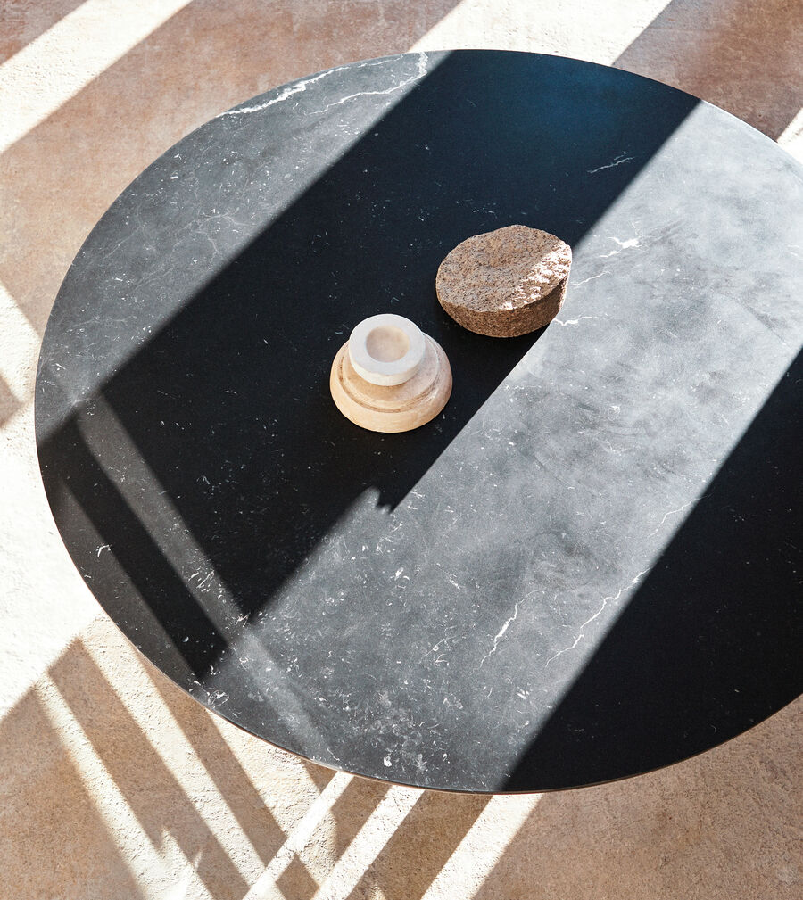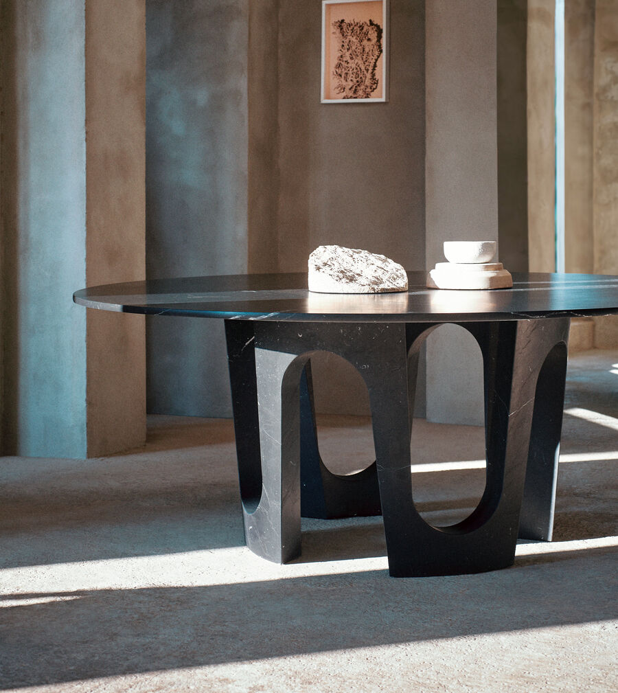 A generously-proportioned round table with a monolithic structure, crafted from a single block of marble. The base forms a series of arches, interpreting the classic Fendi symbol as a modular sequence resembling the letters A and V. Epitomising a true object of design, it is available with a top in Nero Marquinia or Bianco Carrara marble or any of the matt woods from the collection.