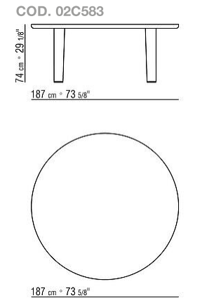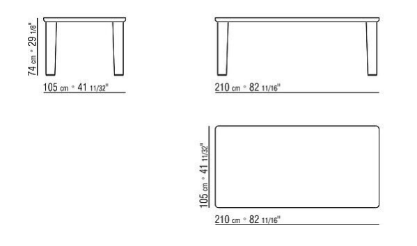 The design of the legs and their oblique placement lend an overall sense of dynamism. The density of the tabletop and of the legs adds solidity to the whole.
