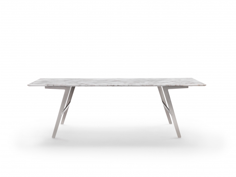 Soffio是一款結構嚴謹的桌子。 扁平的金屬支腿是這款桌子的設計特點。桌腿輕盈向上延伸,勾勒出獨特的“飛鏢”形,把桌子特別具有動感地托離地面。 Soffio桌子,既結實又空靈,輕盈的金屬底座與簡約的長方形桌面構成饒有趣味的對比。金屬底座表面處理有磨砂、鍍鉻、磨光、黑鉻與香檳色,桌面可選用多種顏色的卡納萊托胡桃木或歐洲白蠟木,或名貴的大理石。