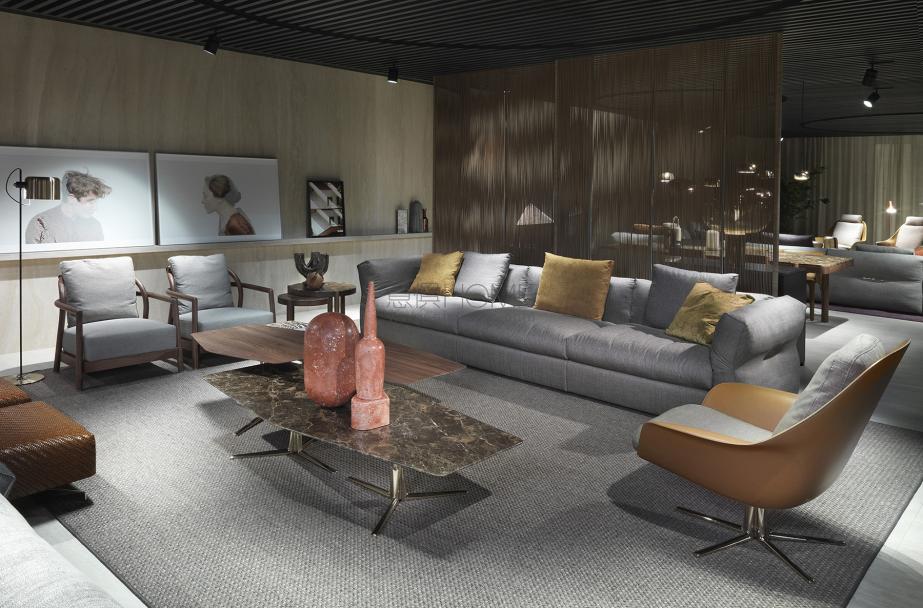 Newbridge沙發(fā)結合了柔和的外形和飽滿的填充物,在兩者之間達到平衡,使它大受歡迎。 底座、座椅部分、靠背和扶手厚度相同,使用一種新型高彈材料作為填充物,超級柔軟:不易變形,彈性十足,而且非常柔軟。這些特征都保障了沙發(fā)的舒適性、耐用性和透氣性。坐墊也有鵝毛版。 可調節(jié)的扶手放大了沙發(fā)的“繭”形外觀,能夠使沙發(fā)達到不同的傾斜度,以此獲得想要的坐姿。 扶手的外部尤其優(yōu)雅,個人定制化的金屬條相當考究,能夠很好地貼合布或皮質包裹物。 這款沙發(fā)高出地面約半米,壓鑄成型的金屬撐腳非常具有設計感。 新橋是一套多模塊化的座椅方案,許多元素構成了這個系統(tǒng) – 93cm和108cm雙重深度建議 – 既能實現適合都市空間的外形,又可以最大限度組合成其它各種復雜的外形。