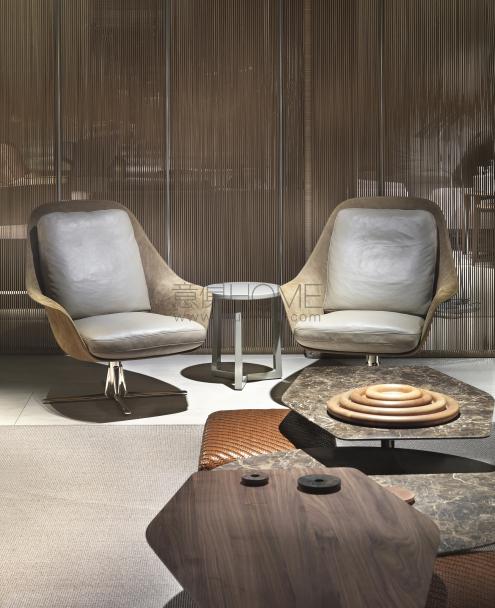 Sveva扶手椅獨特的特征在它優雅的側影中完全得到展示,讓人直接感受到它的飽滿性和舒適性。彎曲的外表由硬結構聚氨酯制成,真皮表面,坐墊松軟,鵝毛填充靠背。在四爪或五爪版本里可以看到可轉動壓鑄鋁底座,后者專為商務領域設計,滿足商務人士需求。 支撐底座可做的精加工工藝包括:拉絲金屬、鍍鉻、拋光,鍍黑鉻和香檳色。 外表可以使用9種不同顏色的真皮,坐墊外包可以使用Flexform系列專屬布料和皮制成,兩者之間可創造出許多搭配方案。 Sveva單人沙發可配同名擱腳凳。支撐底座的設計為一系列不同尺寸的小桌子的設計帶來了靈感,融合了考究的材質,精致的漆藝和珍貴的大理石。 Sveva單人沙發雅致的線條讓它可以輕松和各系列的長沙發搭配在一起,無論是在居家環境下還是在招待客人使用時,都顯得非常和諧。