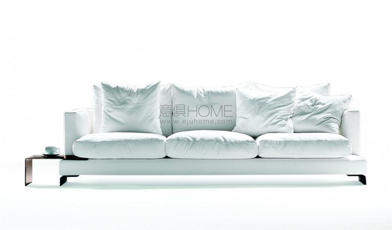 Long Island座椅系統的特點在于比坐墊略微靠后的扶手設計,坐墊深度為111厘米,可選鵝絨填料加不變形材質插件,也可采用聚氨酯和滌綸填料,可保證特別舒適放松的坐姿。 沙發底座設計專門考慮了加插實用的輔助茶幾的位置,茶幾線條簡潔,皮革表面倍添高貴。茶幾的“L”字外形與金屬支腳相呼應,表面處理工藝有磨砂、鍍鉻、磨光、黑鉻與香檳色可選,也可覆蓋皮革,與茶幾相配襯。 Long Island 05款式則采用了隱形支腳。