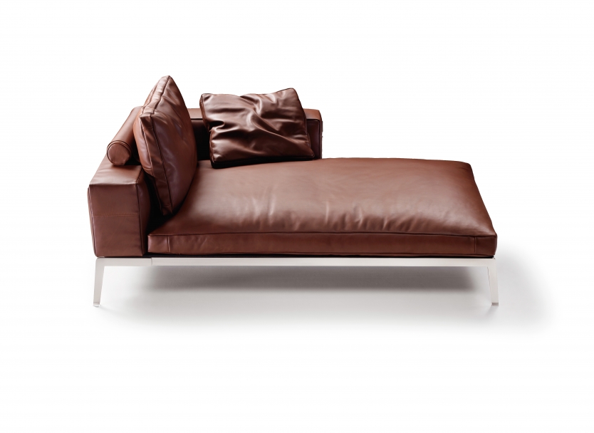 Lifesteel貴妃椅呈現(xiàn)與同名座椅系列同樣的簡潔輕盈的美學特點。方形扶手令人一見難忘,作為尺寸寬大的平行六面體,其高度與靠背完美齊平。 簡潔的金屬底座把沙發(fā)托離地面,底座的表面處理有多種選擇,包括磨砂、鍍鉻、磨光、黑鉻與香檳色。Lifesteel貴妃椅特點在于考究的皮革包裹框架,承托著羽絨坐墊,單一坐墊內(nèi)加入了不變形材料插件。為了輔助理想的坐姿,靠墊也采用了羽絨,并配有滌綸填充的圓筒靠枕。 Lifesteel貴妃椅有兩種尺寸可選,做工細節(jié)豐富,羅緞鑲邊可采用與椅身面料同色或撞色的對比。