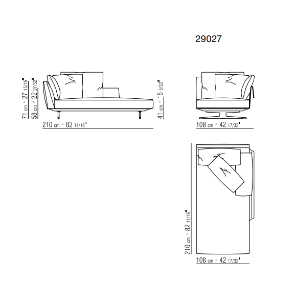 The roomy seat and backrest cushions are generously padded and feature elegant details – like the grosgrain piping – that contrast with the exquisite simplicity of the metal armrest clad in cowhide, available in an array of colors or in suede.