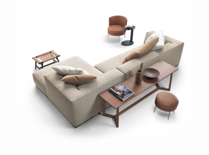 The variety of modules available – stand-alone, L-shaped and asymmetrical seating elements, ottomans, chaise longues, storage elements – allows for the creation of a great number of arrangements, from traditional stand-alone versions with scaled-down size, to larger, more complex solutions, designed to enliven a distinctly contemporary domestic landscape.