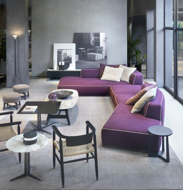 Soft shapes, generously padded in goose down, calibrated proportions, sophisticated tailoring details, like the piping that outlines the silhouette of the upholstered pieces, are some of the distinctive features of this unconventional design.