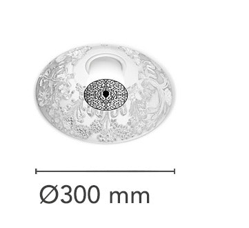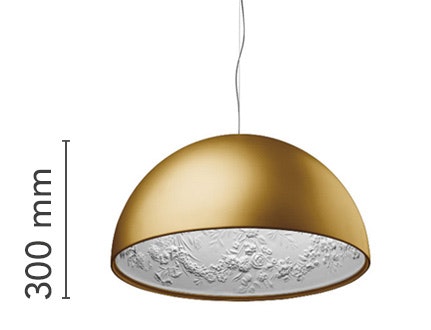 Suspension luminaire providing diffused lighting. Hemispherical, mechanically-processed cast plaster diffuser, painted white inside. Outer finish: rust, glossy black, glossy white or matte gold. Plaster diffuser support in die-cast aluminum alloy. Upper cable gland and blocking ring nut in black injection-molded PC. Shaped, adjustment screws. Transparent, injection-molded, upper and lower silicone shock absorbers. Lampholder and fixing support in PPS. Flashed and blown opal glass diffuser. Molded fixing ring nut in die-cast aluminum alloy with alodine plating. Frieze in photo-etched and mechanically drawn AISI 304 steel. Molded and galvanized steel ceiling attachment. Gray, injection-molded PC rose, painted the same color as the body.
