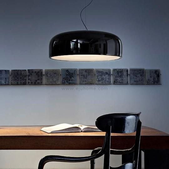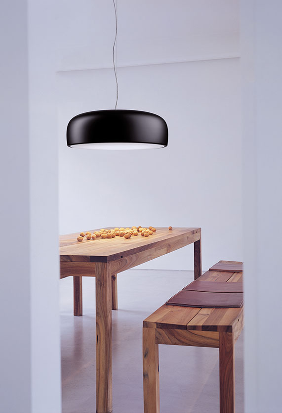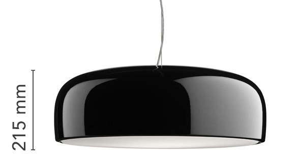 Suspension lamp with direct light. Aluminium body. Available in gloss black, white or MUD. Injection-moulded opalescent methacrylate diffuser. Steel ceiling attachment with steel suspension cable, 5 pole electric cable in PTFE double insulation, working length 400 cm.