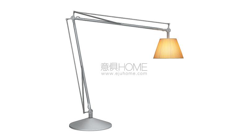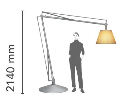 Floor lamp providing direct and diffused light. Acid-etched hand-blown pressed borosilicate glass internal diffuser. Plissé cloth external diffuser. Sand-cast, aluminum diffuser support. Gray painted assembly composed of tubular aluminum arms and tie rods, stainless steel springs, and die-cast aluminum joints. Sand-cast aluminum base with gray painted spun aluminum cover. On the cable there is the electronic dimmer which allows the regulation of light brightness.