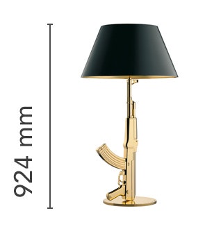 Small table lamp providing direct reading and ambient lighting. Body is die cast aluminum with an overmolded polymer coating and gloss 18K gold plated or chrome finish. Matte black or white plasticized paper shade with an internal gold silkscreened or grey finish. On the cable there is the electronic dimmer which allows the regulation of light brightness.