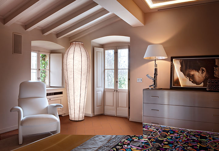 Floor lamp providing diffused light. Internal structure in steel. Cocoon diffuser coated on the structure with transparent protection at the end of the manufacturing process. Base in injection printed ABS. Frieze in silk-screened glass placed at the top end of the reflector obtained by spinning. The ON/OFF functions of the two light sources are by means of dual pedal switch mounted on power cable. The fluorescent tube can be dimmed, conserving the memory of the last setting before turn-off. The second button turns on/off the top lamp for the projection of the decorative frieze on the ceiling. Power cable of useful length 285 cm.
