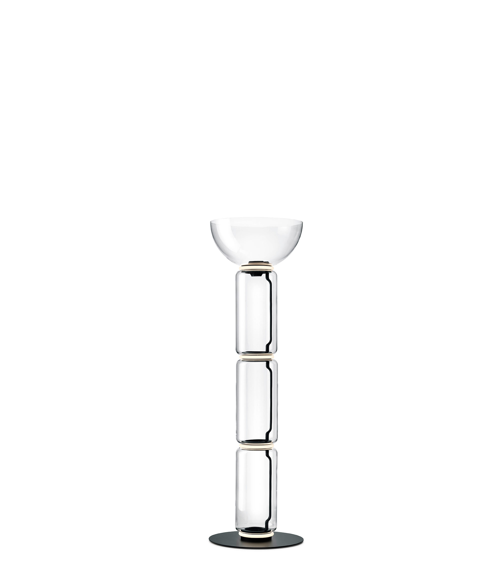 Standing lamps consisting of interconnecting glass modules reaching a height of 2,17 metres (85.43"). Cylindrical and semi-spherical transparent blown glass structure, die cast aluminium base and rings, hydroformed steel internal lateral arms and injection moulded optical opal silicone outer ring diffusers. The power supply cable is 2 metres (78.74") long, with a pedal operated panel used as a dimmer to adjust the light intensity by 10% to 100% in either direction. Wall mounted power supply unit with interchangeable plugs.